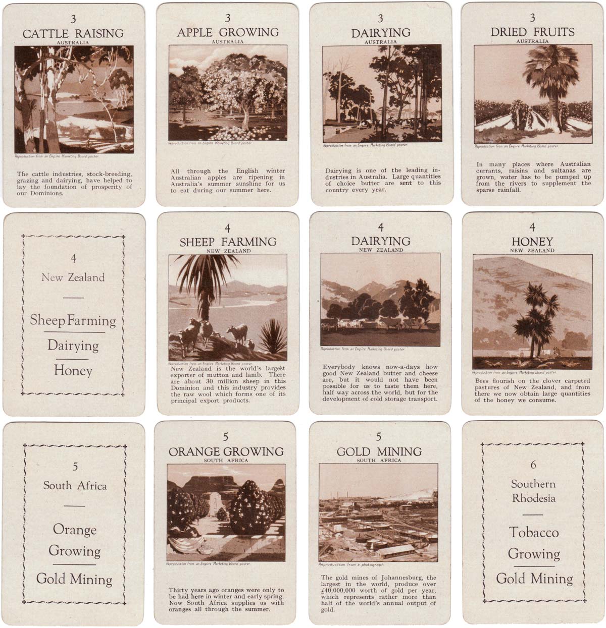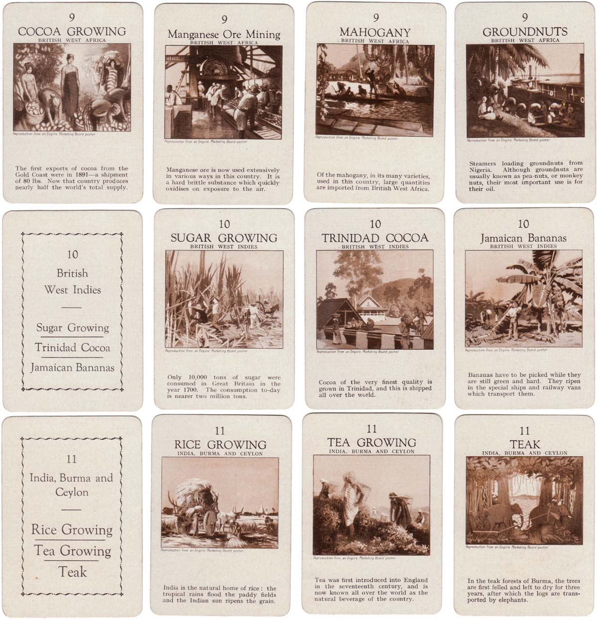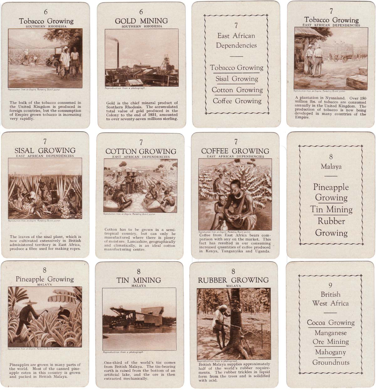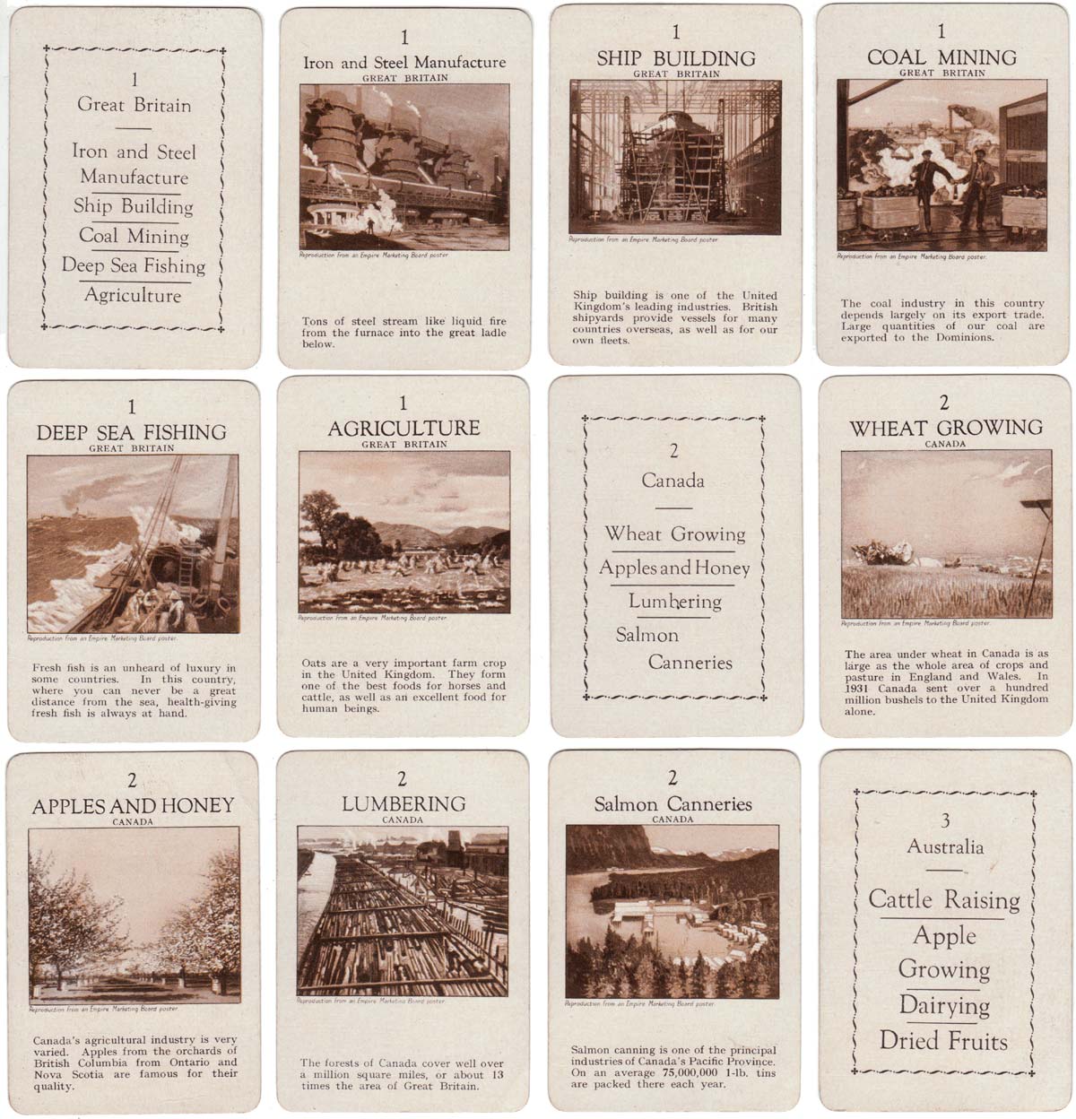 “Countries of Empire” educational card game published by John Jaques & Son Ltd, c.1930s. The picture cards are illustrated with reproductions of Empire Marketing Board posters showing various industries and activities. See the Rules►