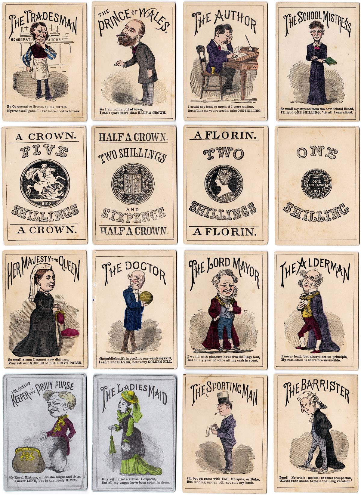 Above: Lend Me Five Shillings; or, Her Majesty’s Privy Purse by John Jaques & Son, c.1875. Two missing cards have been faked. The reverse is plain blue.