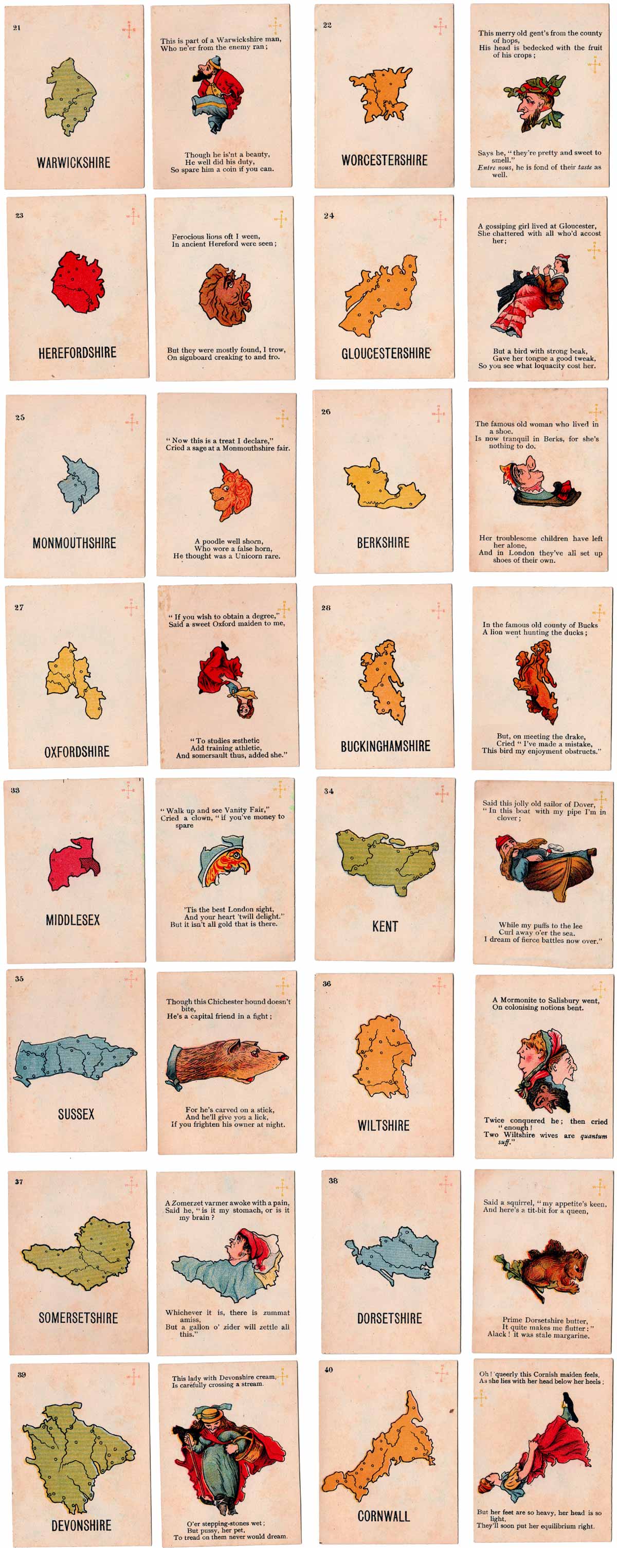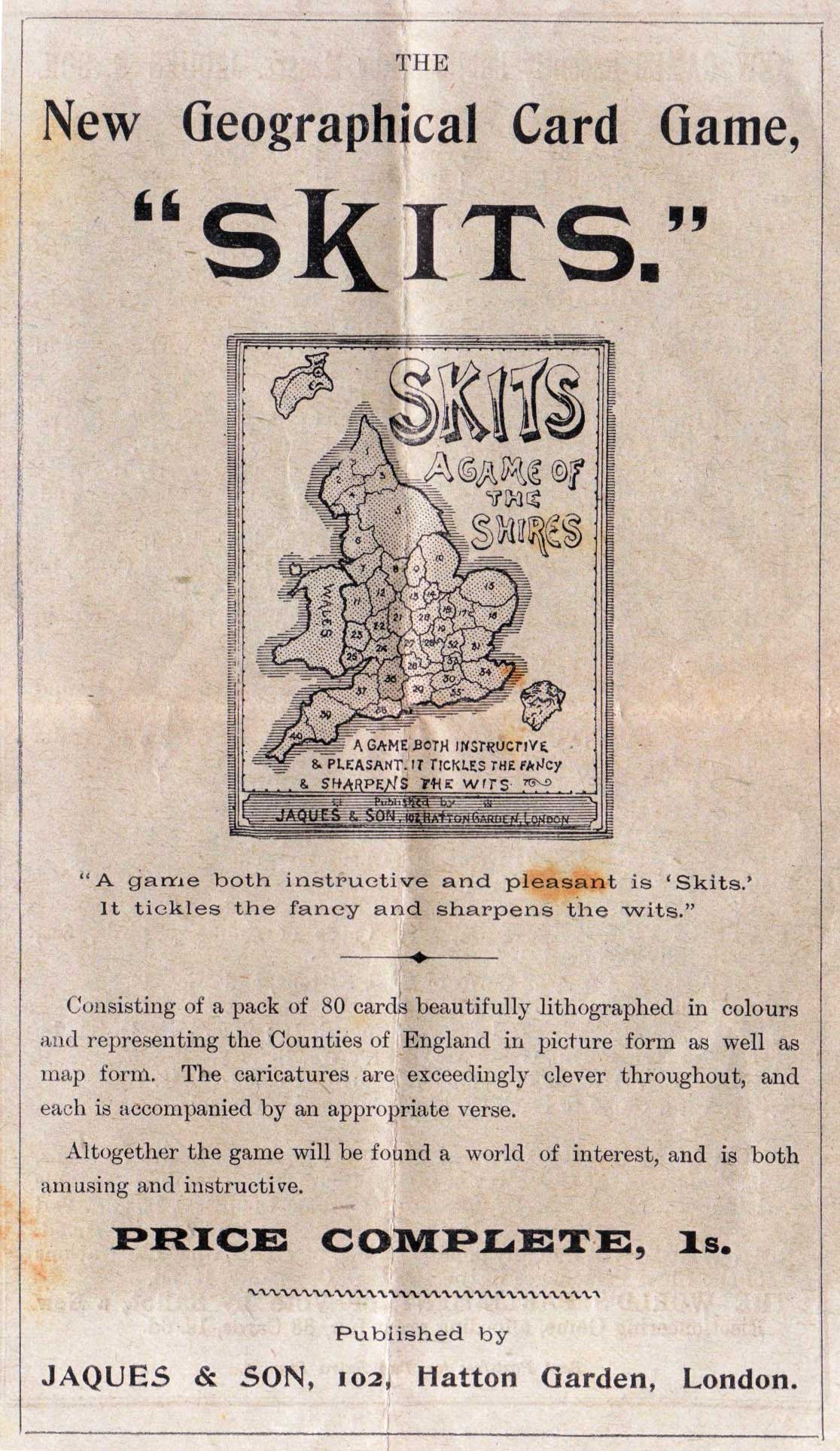 Skits is a geographical card game based around the counties of England, published by Jaques & Son, 102 Hatton Garden, London, c.1900. Described on the box (right) as “a game of the shires, both instructive and pleasant, it tickles the fancy and sharpens the wits.” The cards contain caricatures and also amusing verse. The object of the game is to match map cards with their picture cards, and to play out all your cards to win. See the Rules►