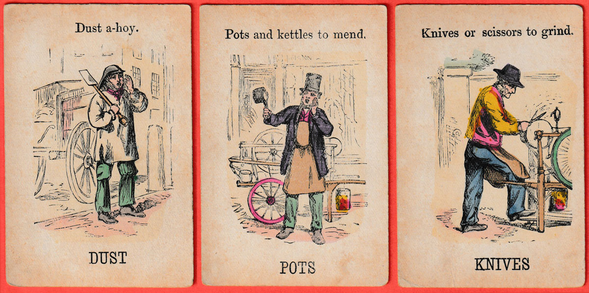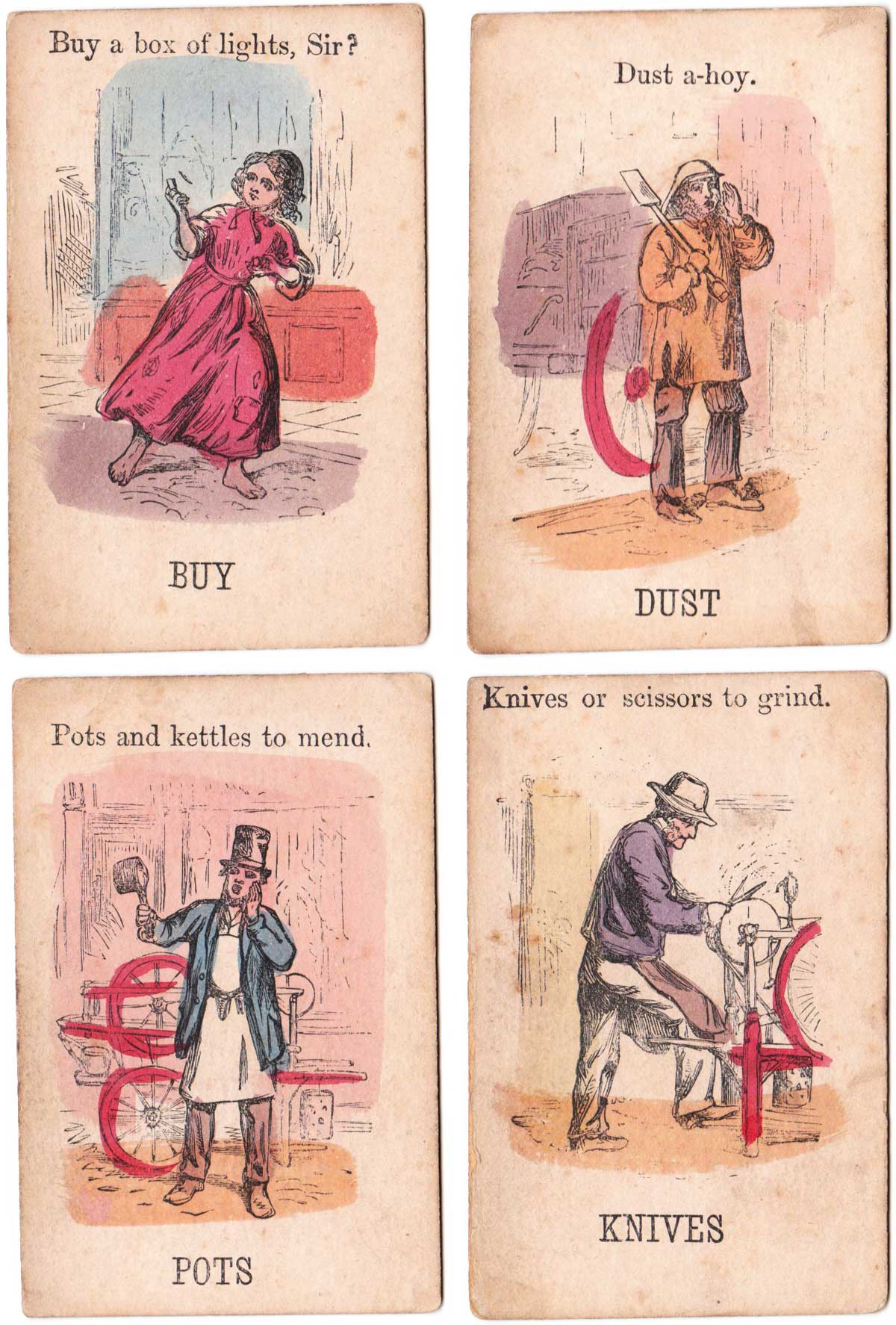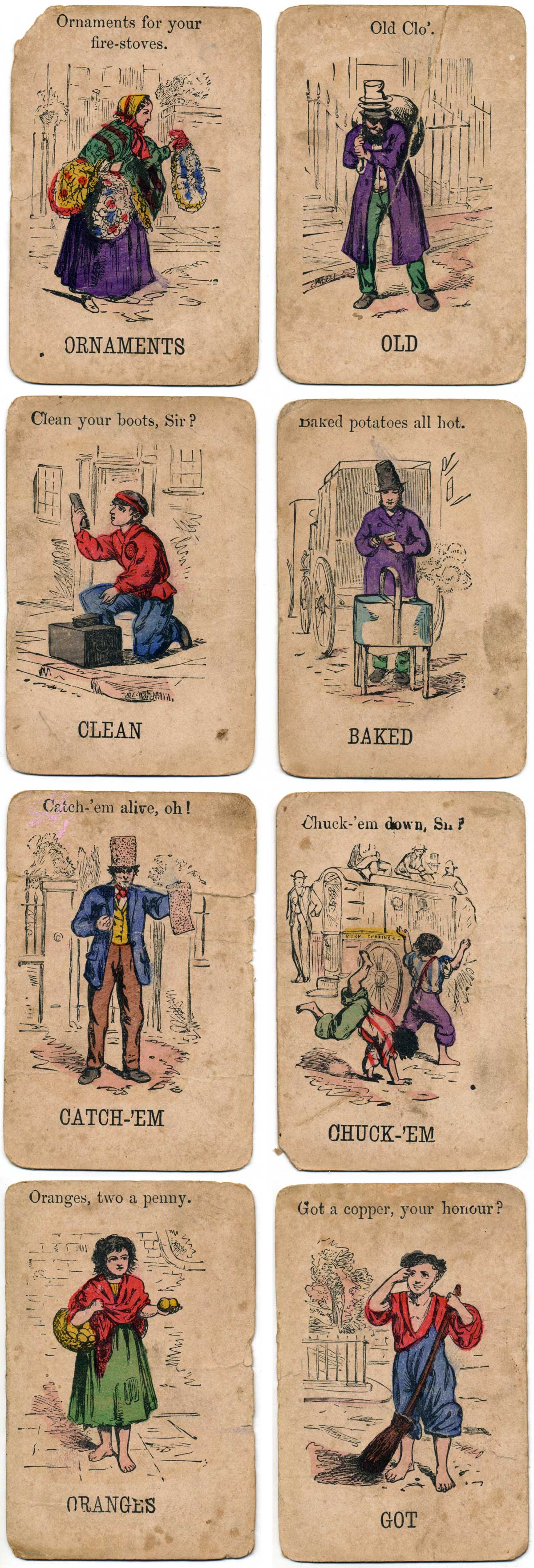 Victorian parlour game described as “a merry round game for from four to eight players” published by John Jaques & Son, London, c.1880. The complete street cry is printed along the top of each card and players compete to complete the most sets of street cries.