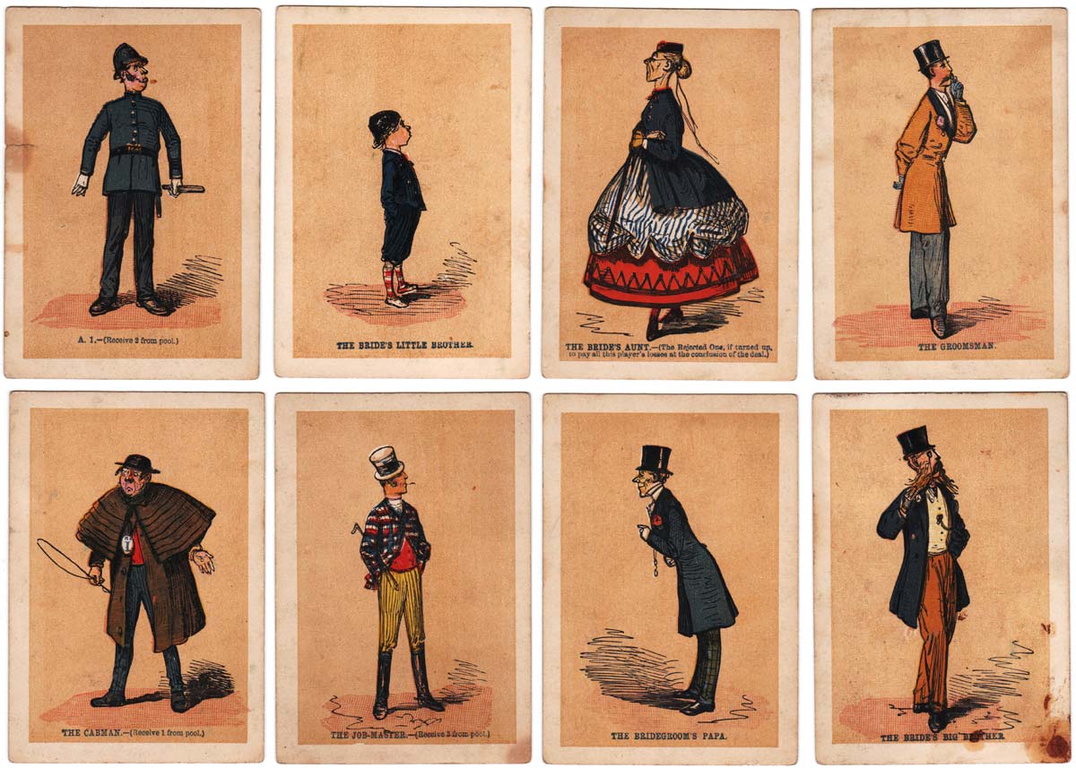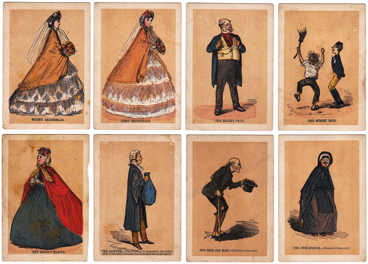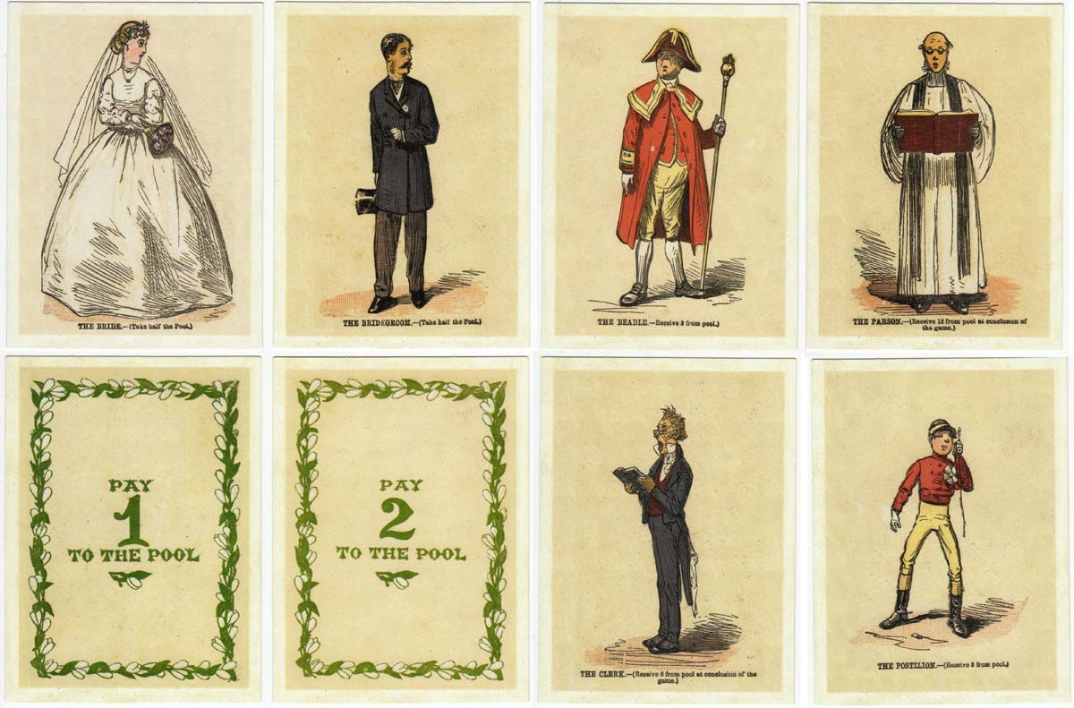 The Wedding card game, with illustrations of the chief personages in the marriage ceremony, first published by Jaques & Son, c.1875. The set contains 24 character cards and 25 pay cards, plus instructions. It was re-published as “The Wedding Game” by F.G & Co in 2004.