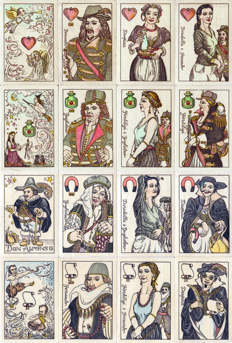 Cosi Fan Tutte was published in 1994 and is based on Mozart's opera. The pips (heart-shaped locket, magnet, marriage contract and poison bottle) are key objects in the development of the operatic plot. The Kings are the two male lovers in their normal costume and then dressed as Albanians. The Queens are the female leads with their lovers, in and out of disguise, in the background. The Jacks show Despina in and out of her disguises while the fourth is Fiordiligi. The Aces are embellished with cupids, satyrs, angels and witches. The standing Joker is Don Alfonso.