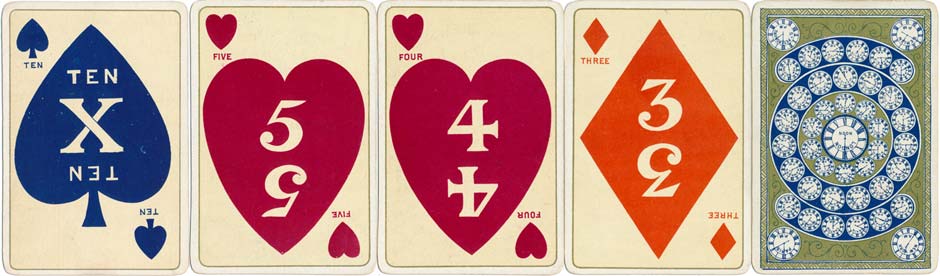 Above: numeral cards from Kimberley's Royal National Patriotic playing cards, second edition c.1893-97. The numeral cards have conventional suit sign sizes and arrangement.