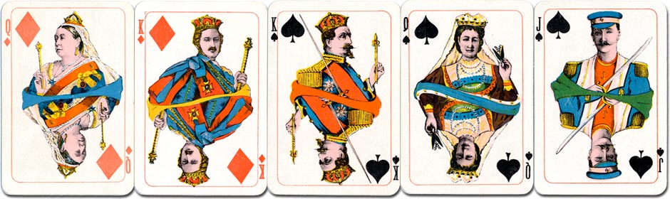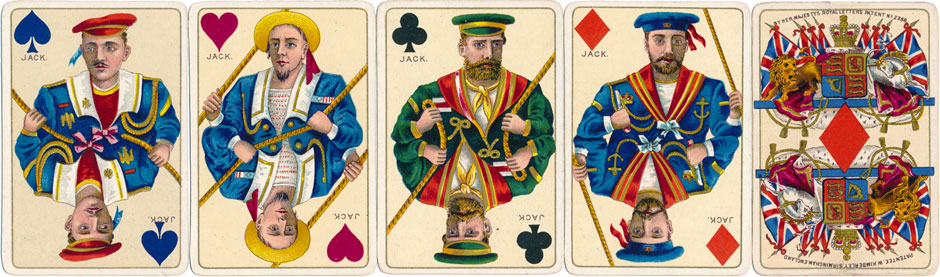 Above: Kimberley's Royal National Patriotic playing cards, first edition c.1892-3. The court cards are richly coloured and incorporate gold see more →