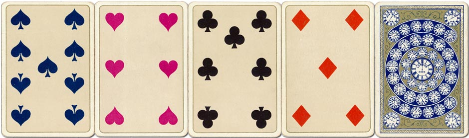 Above: Kimberley's Royal National Patriotic playing cards from the fourth edition published c.1899-1901. The Jack of Hearts is a typical representative from the U.S. Navy of the time. The King of Clubs shows Kaiser Wilhelm II. Unlike the first edition which was printed in luxurious colour lithography including gold, the designs here are rendered by means of fine outlines, stipple printed in black, with areas of mainly flat colour. The back design in this edition features a clock design ~ click image to zoom ~ and the set has an additional red descriptive card.