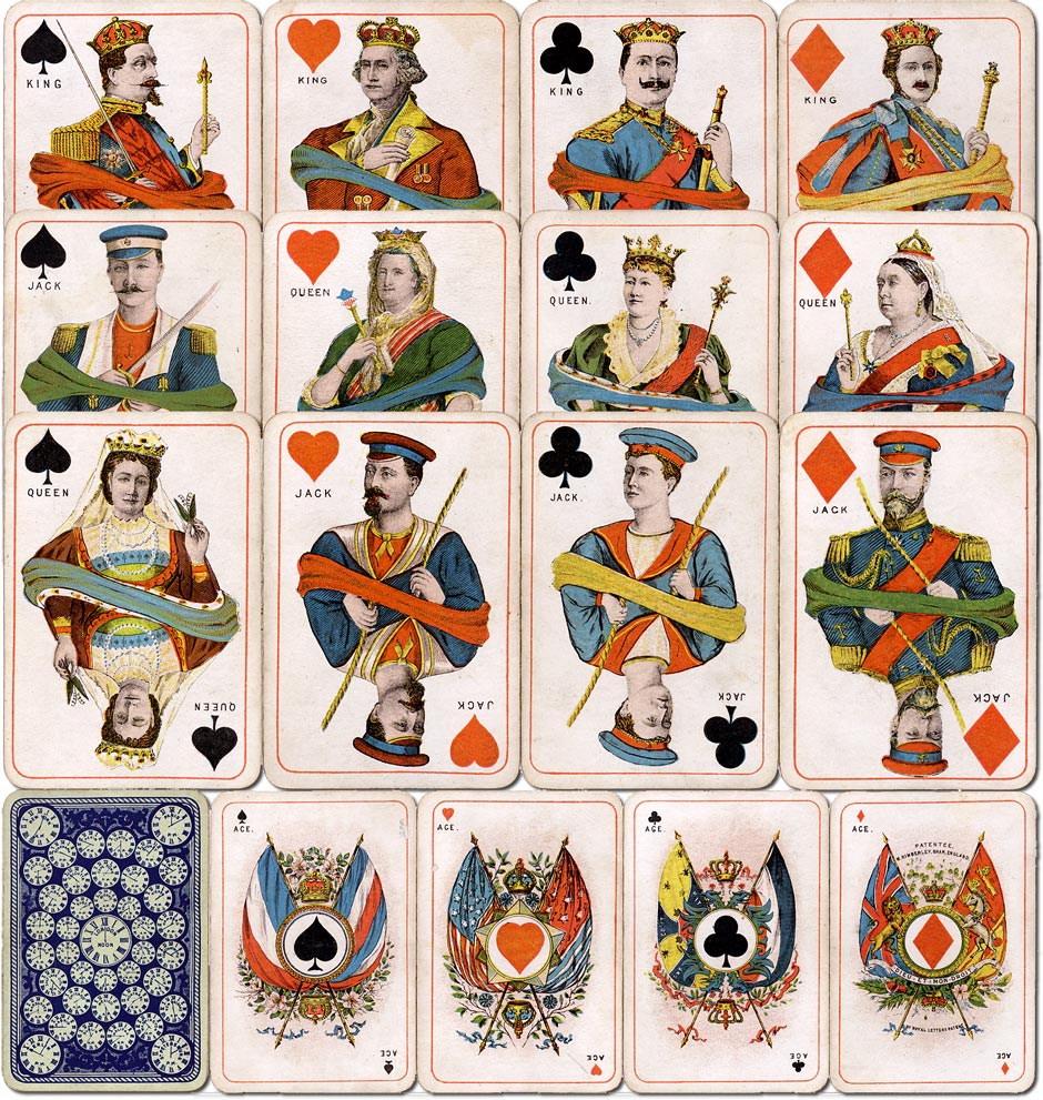 Kimberley’s National Patriotic playing cards represent four nations: Diamonds represent England, Hearts represent America, Spades represent France and Clubs represent Germany. The Ace card of each suit represents the Royal Standard or flag of each Nation. For England (Diamonds) the Union Jack; for America (Hearts) the Stars and Stripes; for France (Spades) the National Colours and for Germany (Clubs) their Royal Standard. Courts represent contemporary and past royalty. The backs usually show an array of clocks in various colours.
