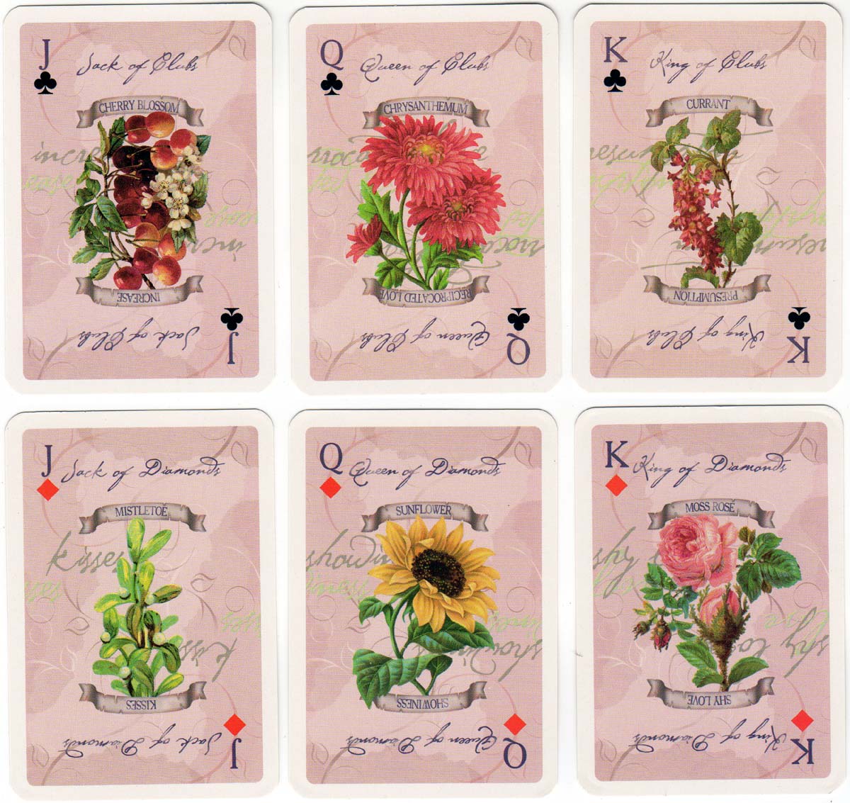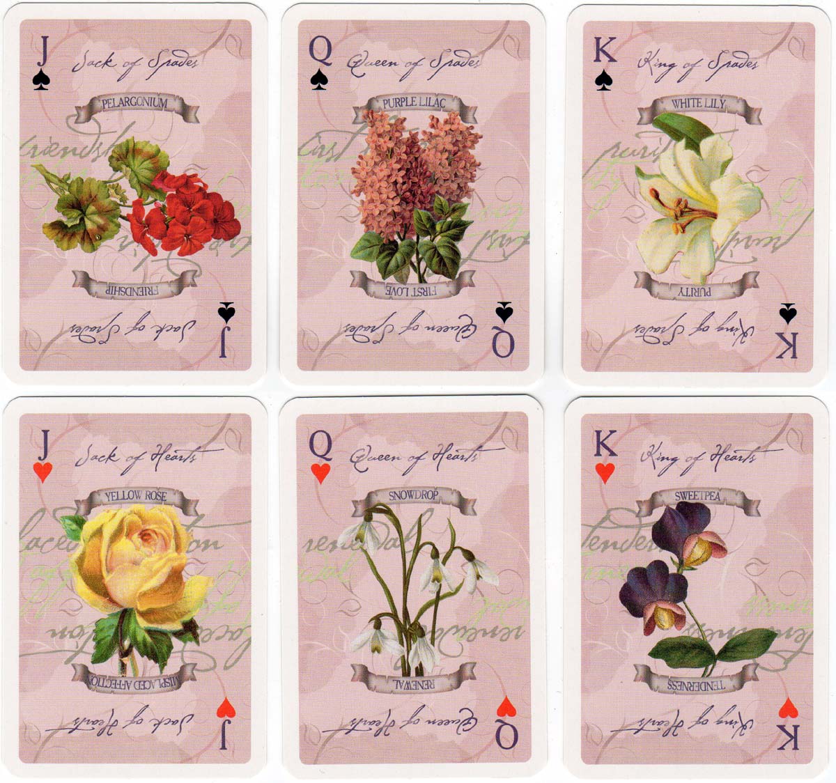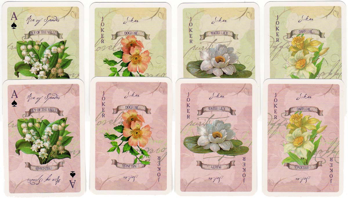 Above: Language of Flowers double set playing cards published by Past Times, c.1999. 52 cards + 3 jokers in each pack, over-sized poker-width cards.