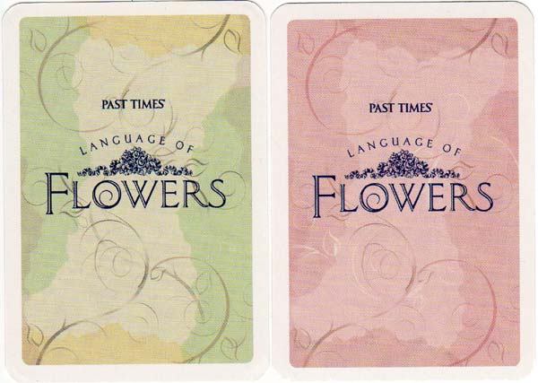 “Language of Flowers” dual pack of playing cards published by Past Times, depicting Victorian flower scraps and their meanings. Each pack is the same, except for the ground colour (pink or green). See the Box►