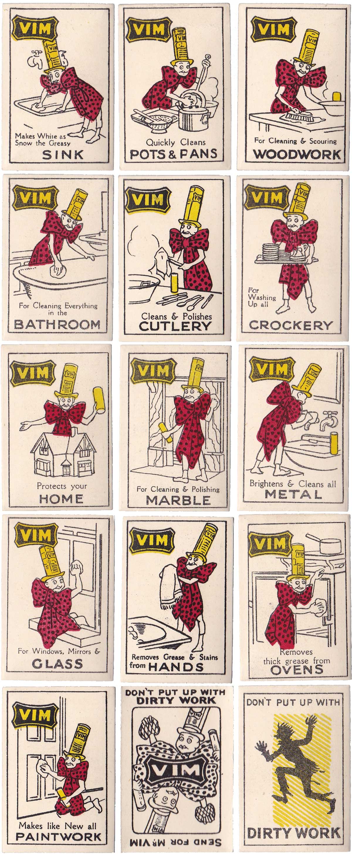 Above: Lever Brothers miniature card game promoting Vim, 1930s. 30 cards plus the coloured Dirty Work Card. The black and white Dirty Work card is the back design. Card size = 35mm x 52mm.