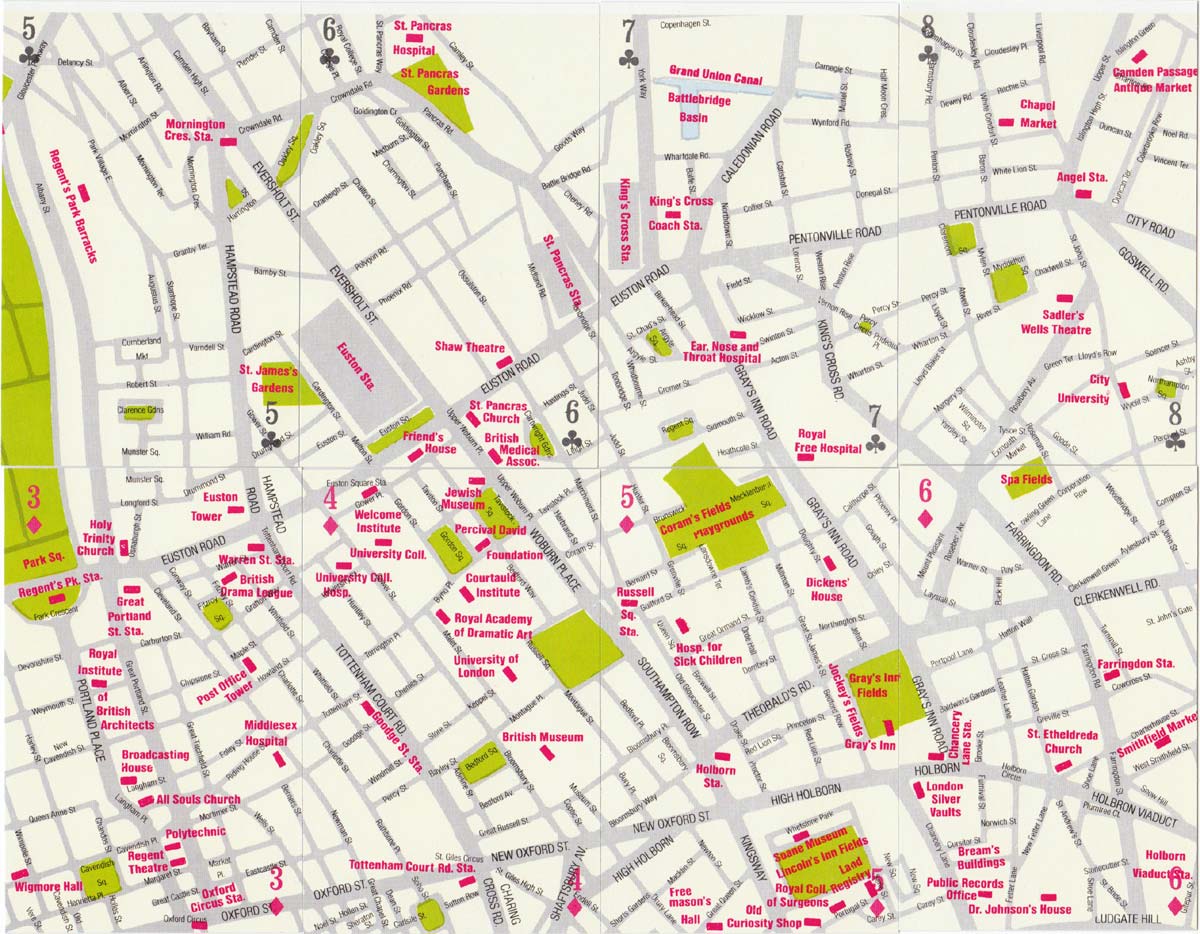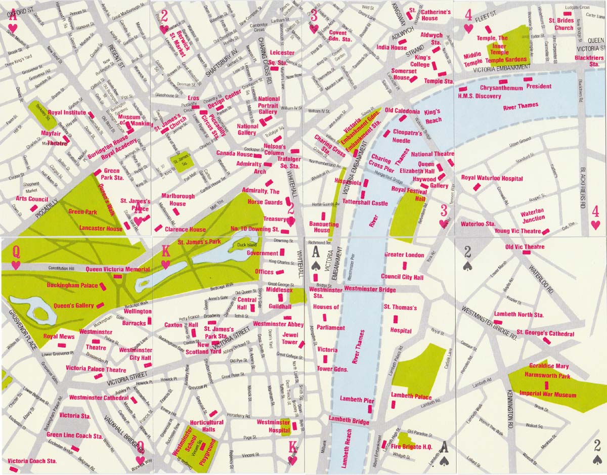 Above: cards from “London on Playing Cards” published by Yasha Beresiner, Intercol, London. The complete pack contains 52 cards + 3 jokers + booklet in box, printed by Carta Mundi, 1989.