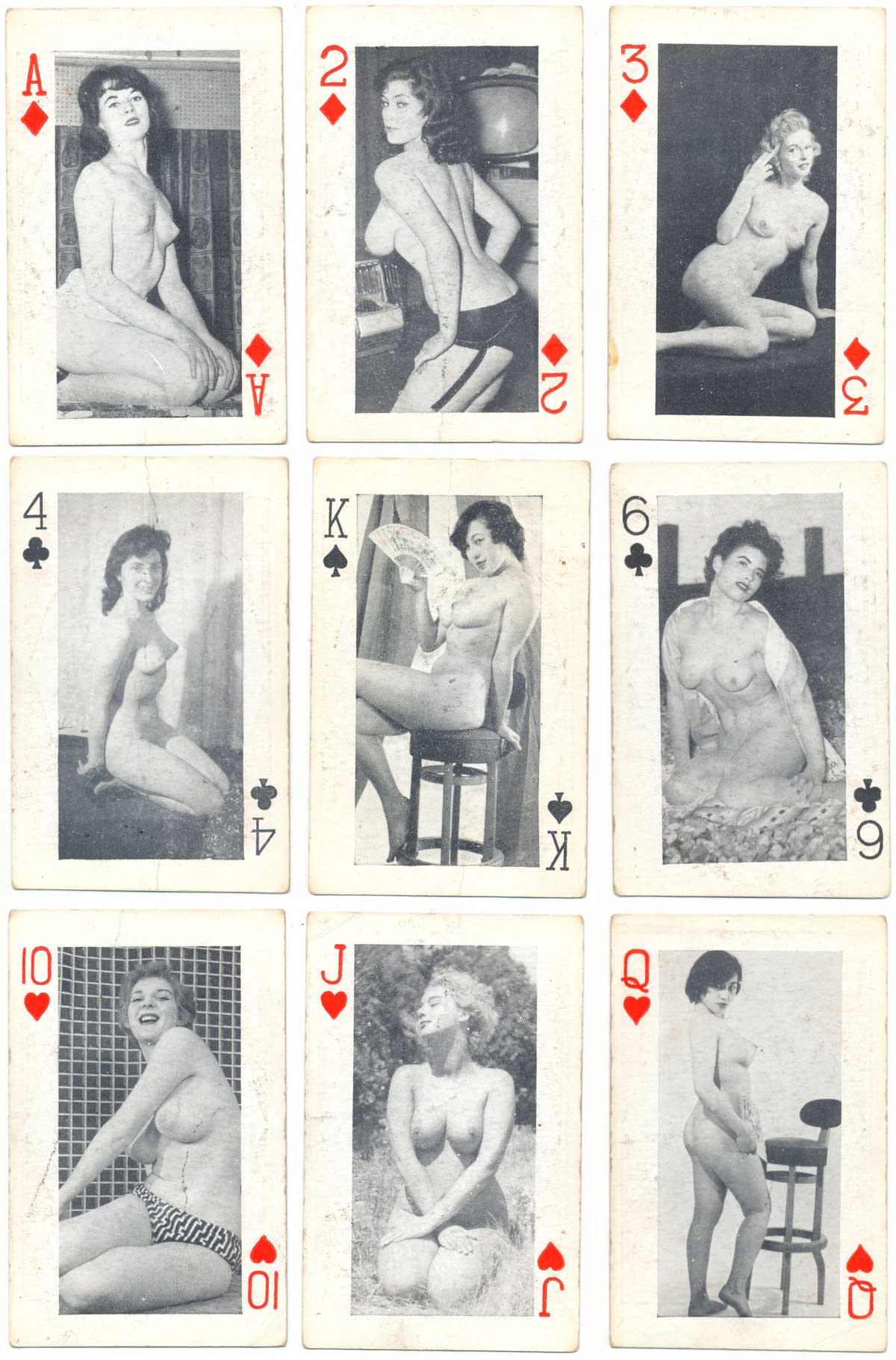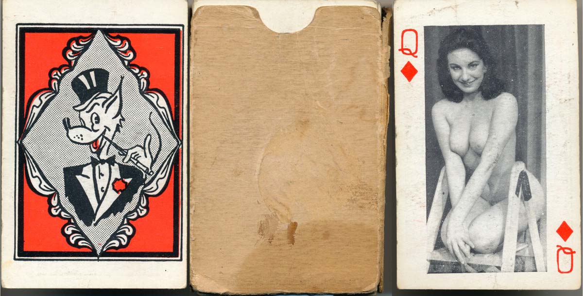 Above: Photographic playing cards - each face having an "art study" of a female nude, Mayall Press, Stockwell, London, c.1946. This edition has square corners and over the years different editions were published with different models. Images courtesy Matt Probert.