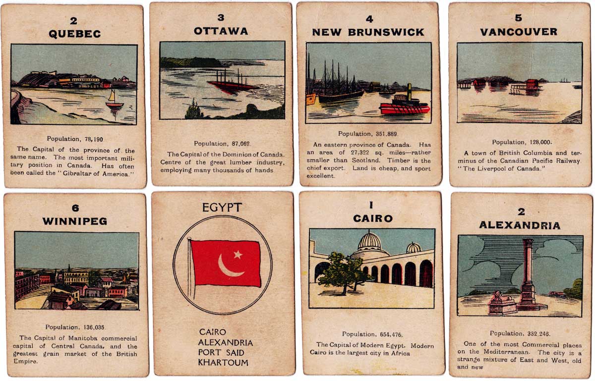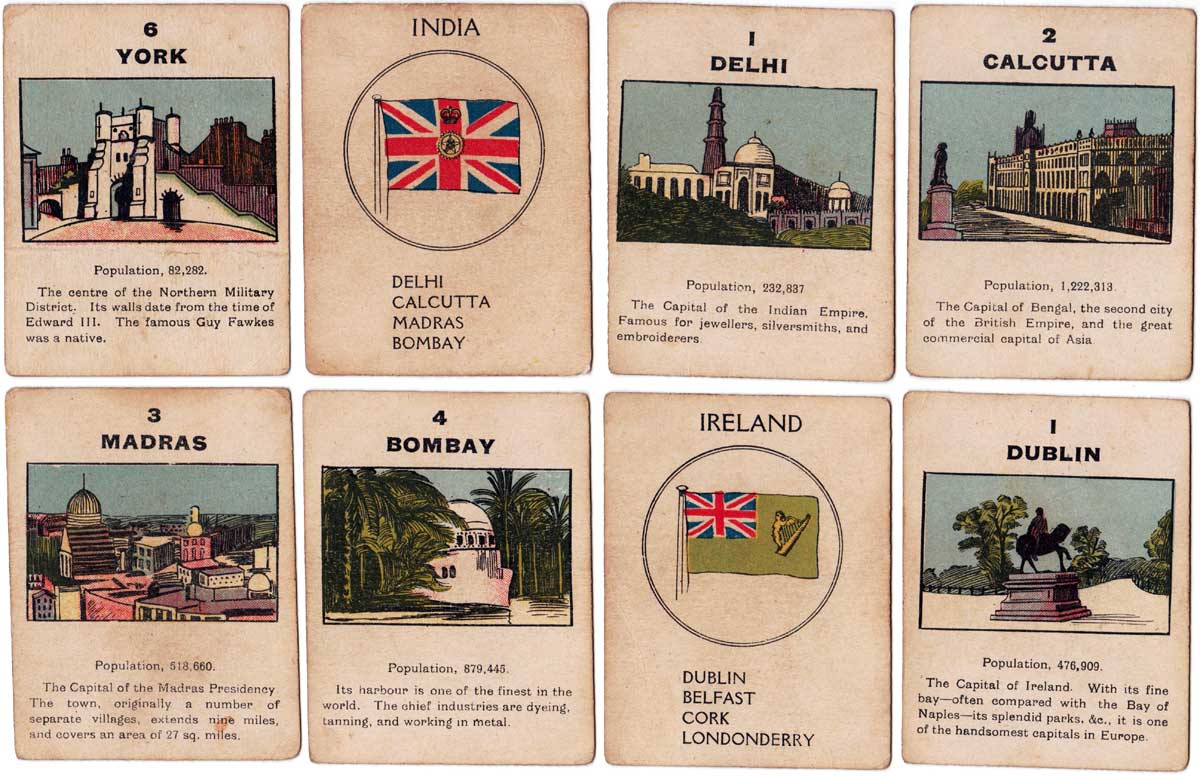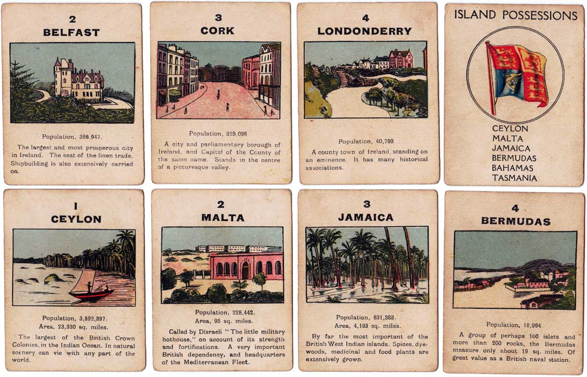 Above: cards from The British Empire card game published by Norvic Mill, c.1920. 56 cards + rules in box. For all four card games they used the same back design.