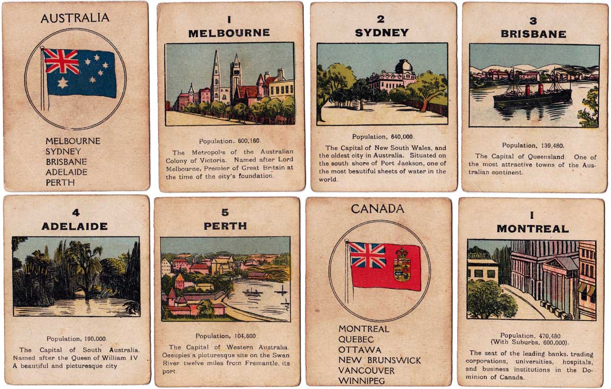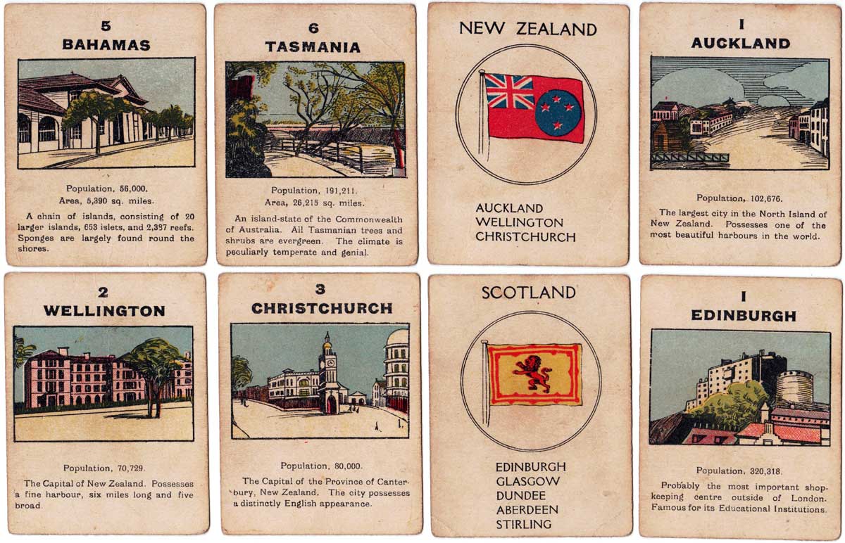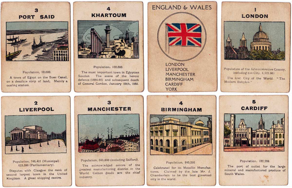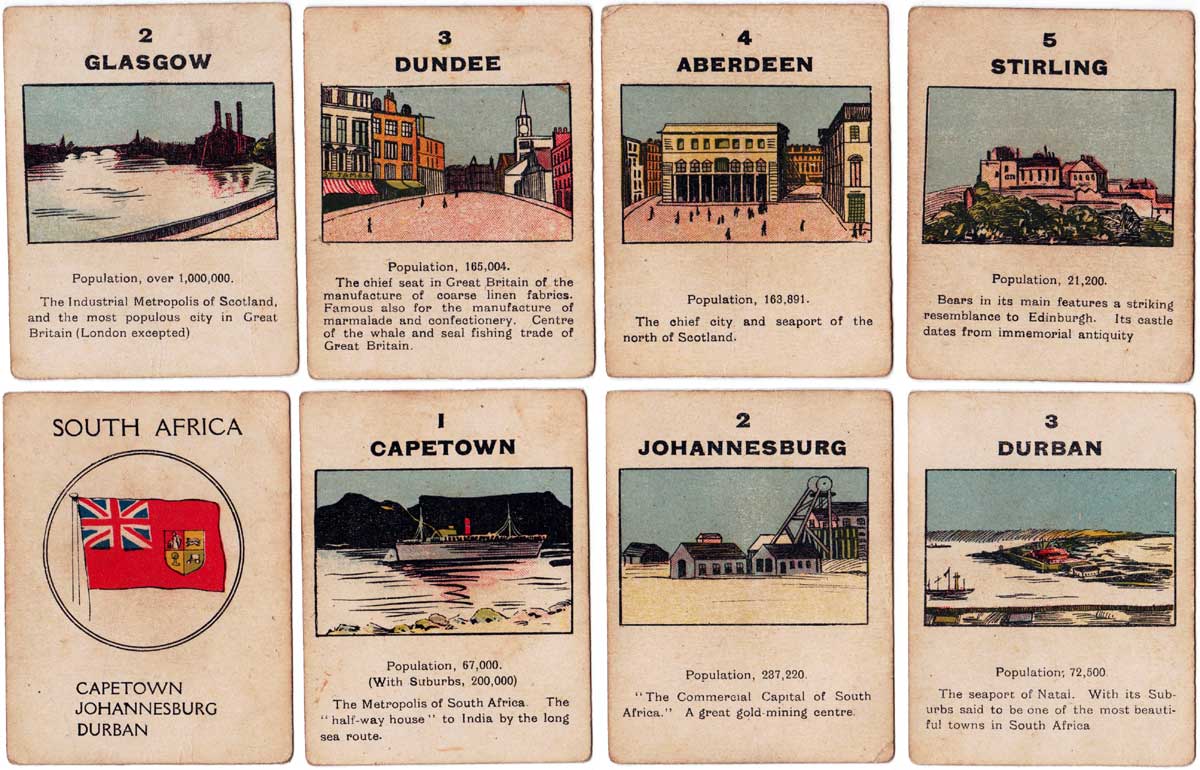 Above: cards from The British Empire card game published by Norvic Mill, c.1920. 56 cards + rules in box. For all four card games they used the same back design.