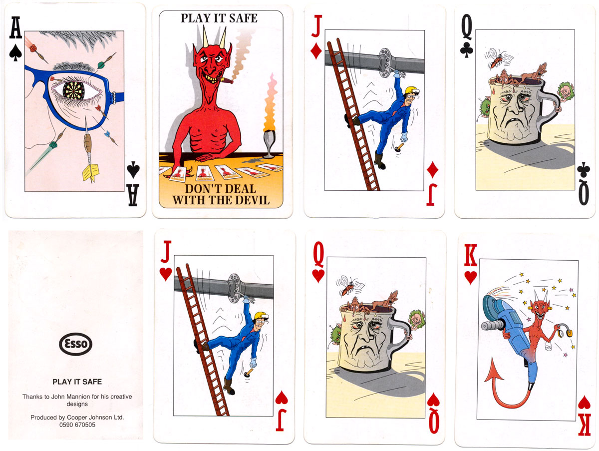 A health and safety promotion deck designed by John Mannion, distributed by the oil company Esso and produced by Cooper Johnson Ltd in the UK. All the pip cards are plain, the aces and courts show the same image in each suit.