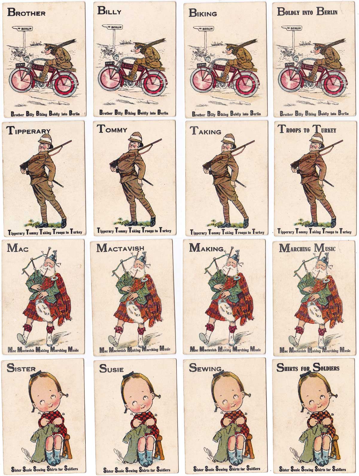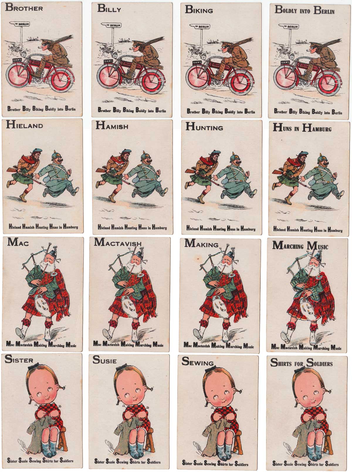 I have 2 packs of this game which must be 1st world war time. Both packs have 32 cards (ie 2 of each card) but there is a different “family” in each (Hieland Hamish in one and Tipperary Tommy in the other). The boxes could each easily contain another 4 cards which would make a complete pack of 36. Bit of a coincidence if both packs are a “family” short though. And if you look at the picture on the boxes there is another card illustrated with a girl with her hand on a soldier’s shoulders. There would not be enough room in the boxes for another 8 cards. Make of it what you will!