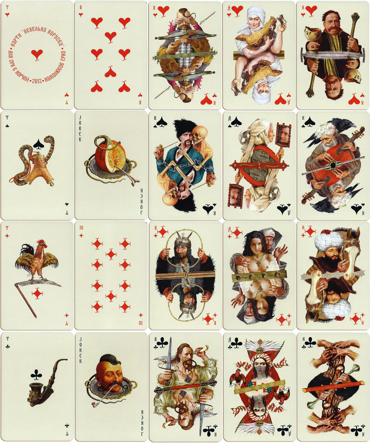 “Pekelna Horugva” is the second deck designed by Ukrainian illustrator Vladislav Erko, manufactured by Nage Cards, Saint-Petersburg, 2012. Vladislav Erko is noted for his beautiful artwork in children’s fairy tale books, as well as his earlier deck for “Taras Bulba” the Moscow restaurant which serves traditional national cuisine. In this second deck, which also contains some culinary references, the imagery has turned rather grim and appears to be based on the mystical works of Nikolai Gogol expressing ethnic and nationalist themes, including death.