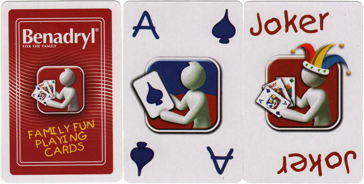 Benadryl® family fun playing cards published by Johnson & Johnson with informal designs and non-standard pip colours. See the Box►