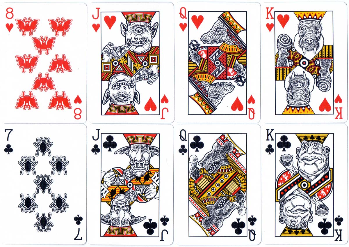 Creature Comfort playing cards designed by Don Moyer and published by Calamityware feature intriguing monster courts with their favourite comfort foods. The numeral cards have unique pip designs for every card - no repeats. The attention to detail and great drawings are much more fun than traditional faces and are completely acceptable for all card games.