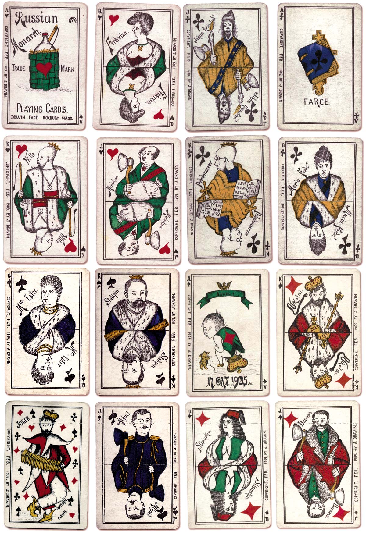 RUSSIAN MONARCH PLAYING CARDS: a rare American Russian political pack by J. Dravin, Roxbury Mass, 1909, depicting events and moods in early 20th century Russia. Each suit has its own colour scheme.