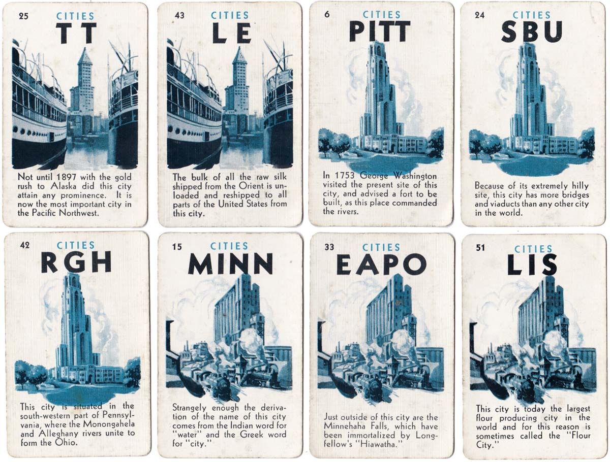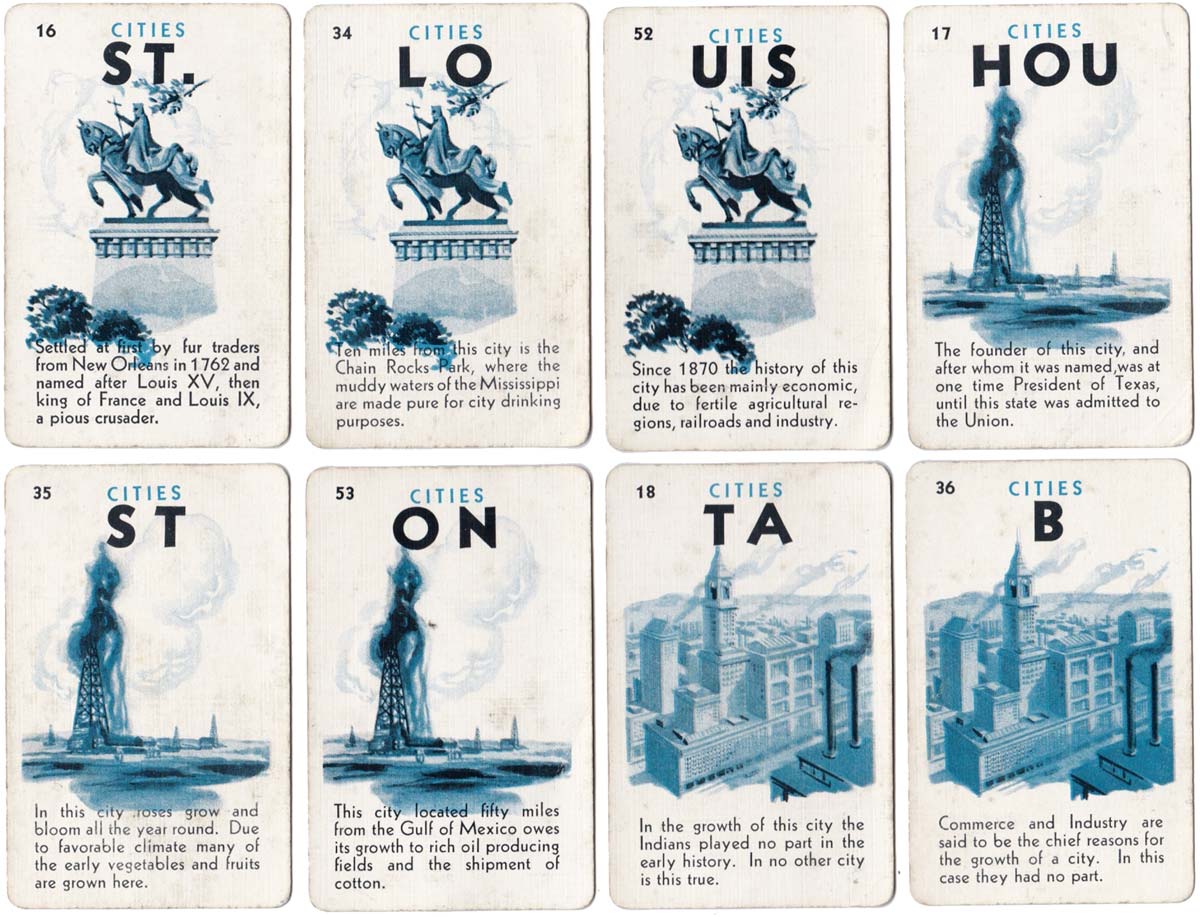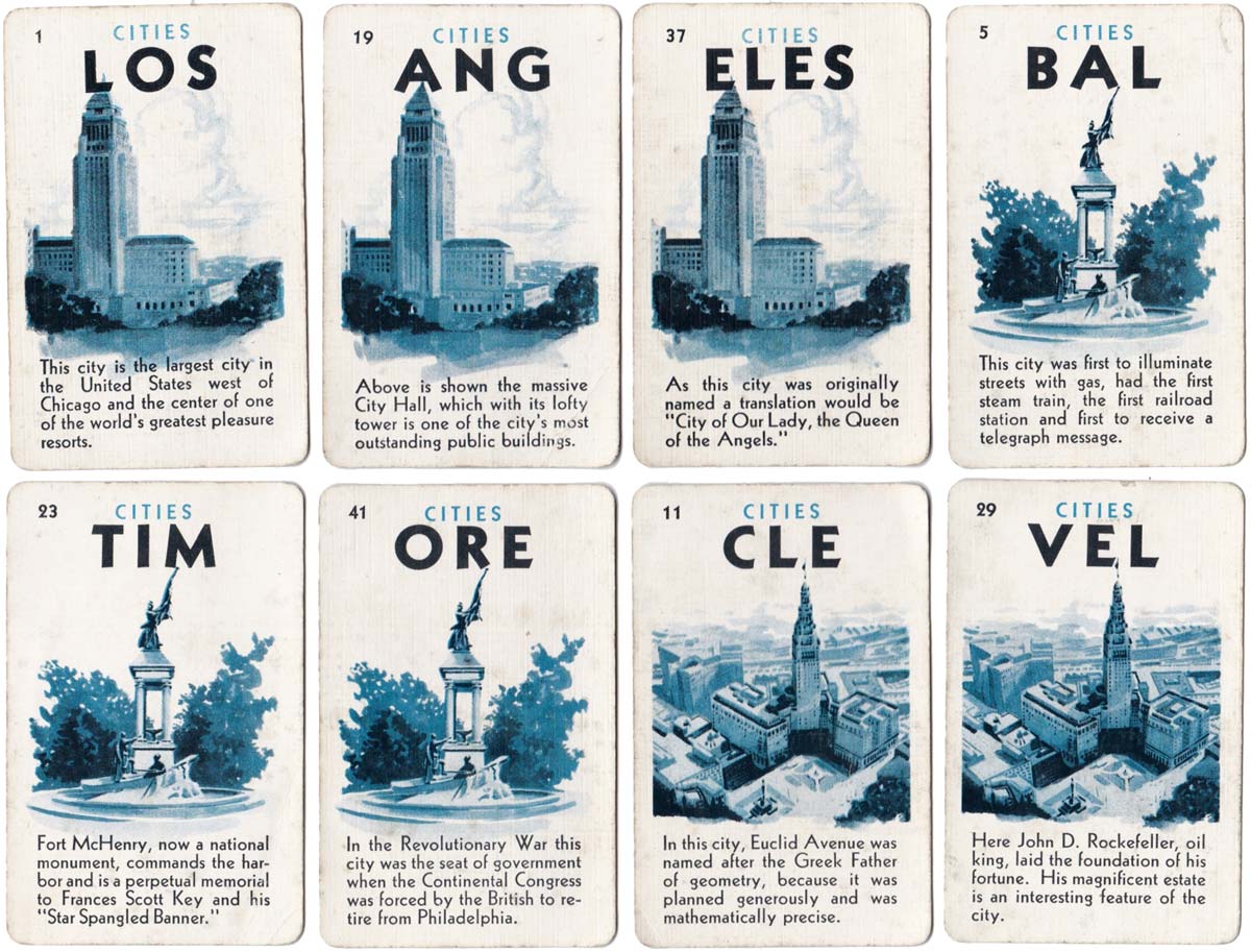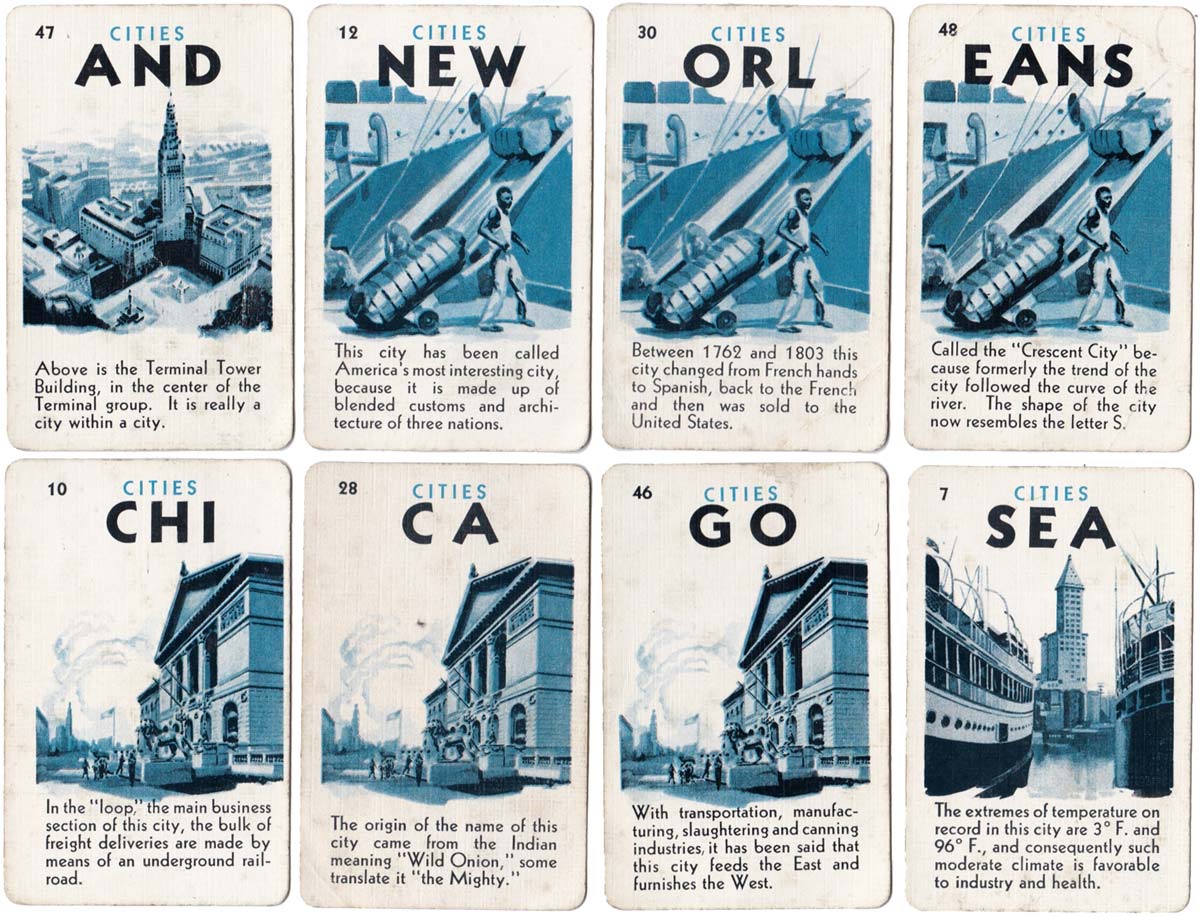 Above: cards from Game of Cities published by E. E. Fairchild Co, 1932. The city of Taboo is fictitious and also a penalty in the game. 54 cards + rules in box.
