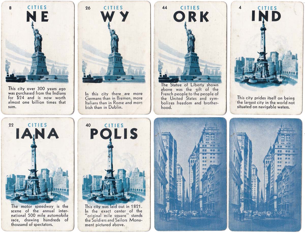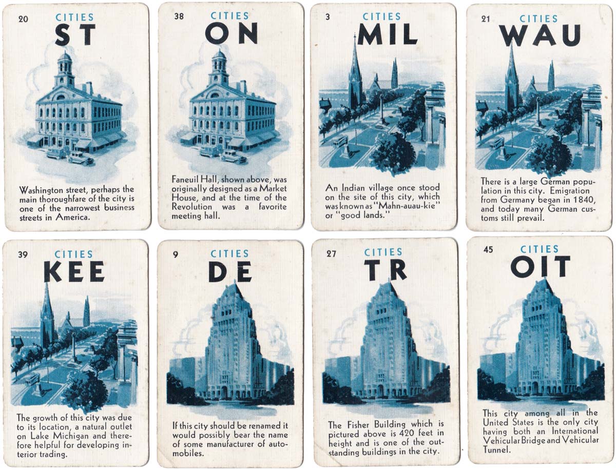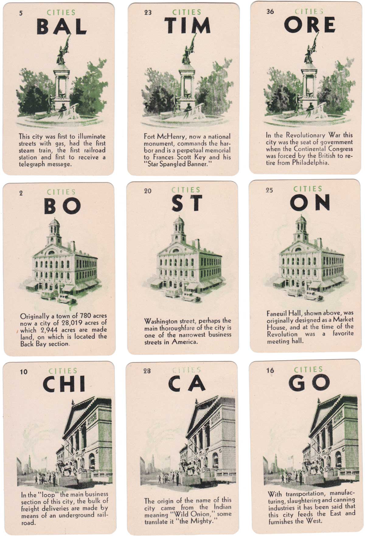 Above: cards from Game of Cities published by E. E. Fairchild Co, 1932. The city of Taboo is fictitious and also a penalty in the game. 54 cards + rules in box.