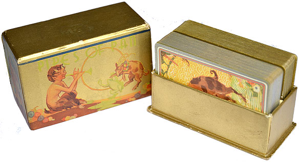 Featuring geometric Art Deco designs in lovely pastel colours, this set comes in a double box, branded as “Pipes of Pan” and published by Fan-C-Pack Co., Inc, New York, USA. The Pan deck is gilded, the goat deck is silvered, each deck subtly matching the gold and silver. Other back designs are known.