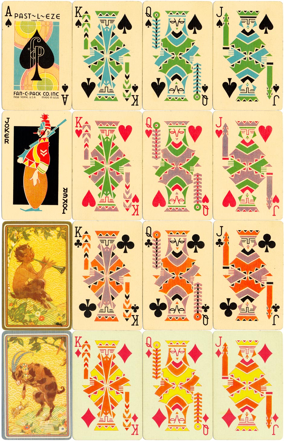 Above: 'Past-l-Eze' playing cards published by Fan-C-Pack Co., Inc, New York, c.1935. 2x 52+J in special double box. The extra insert cards reads: “Past-l-exe is our exclusive brand name applied to playing cards. Instead of glaring white, you are faced with a soft, pleasing pastel colour, green or cream. Easy and non-glaring on your eyes.” Some of these packs are believed to have been manufactured by E. E. Fairchild because wrappers have been found with the tax stamp cancelled by E.E. Fairchild Corp. The cards are bridge size, measuring 89mm x 58mm.