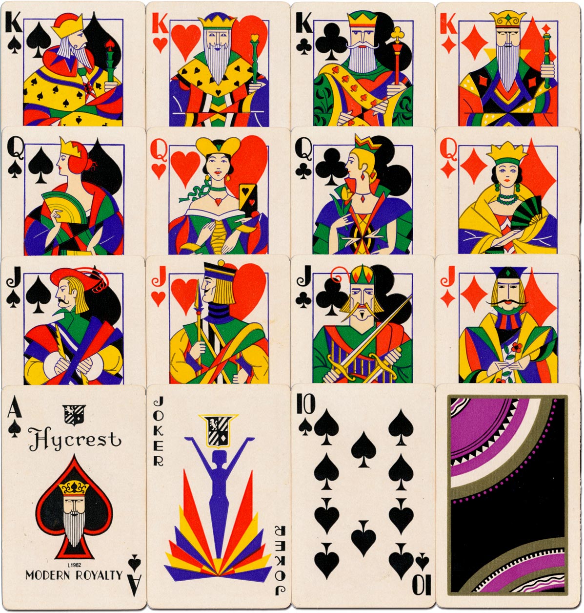 Above: 'Modern Royalty' playing cards published by the Hycrest Playing Card Co., New York, c.1931 (probably printed by U.S.P.C.C.). Available with several differently coloured backs. Images courtesy Barney Townshend.