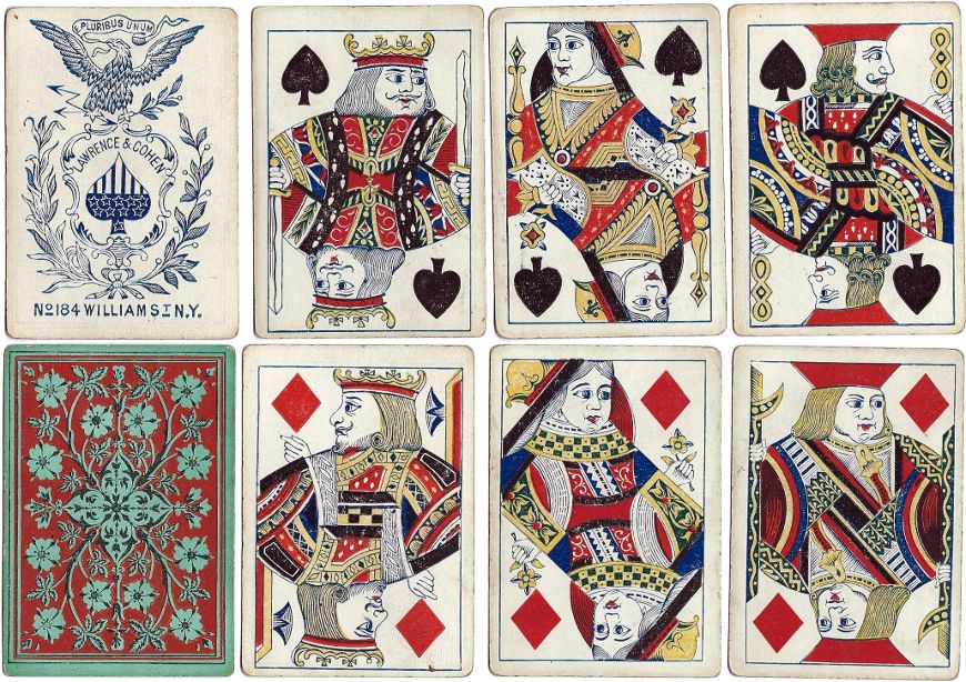 Lawrence & Cohen were successors to Lawrence, Cohen & Co.. During the relatively short period that Lawrence & Cohen decks were produced with the William Street address (c.1860-1873) both single and double-ended courts were manufactured. The court card designs closely resemble those of some British manufacturers, especially De la Rue, and a certain amount of copying went on between Belgian, English and American manufacturers. The company was merged into The New York Consolidated Card Company in 1871.