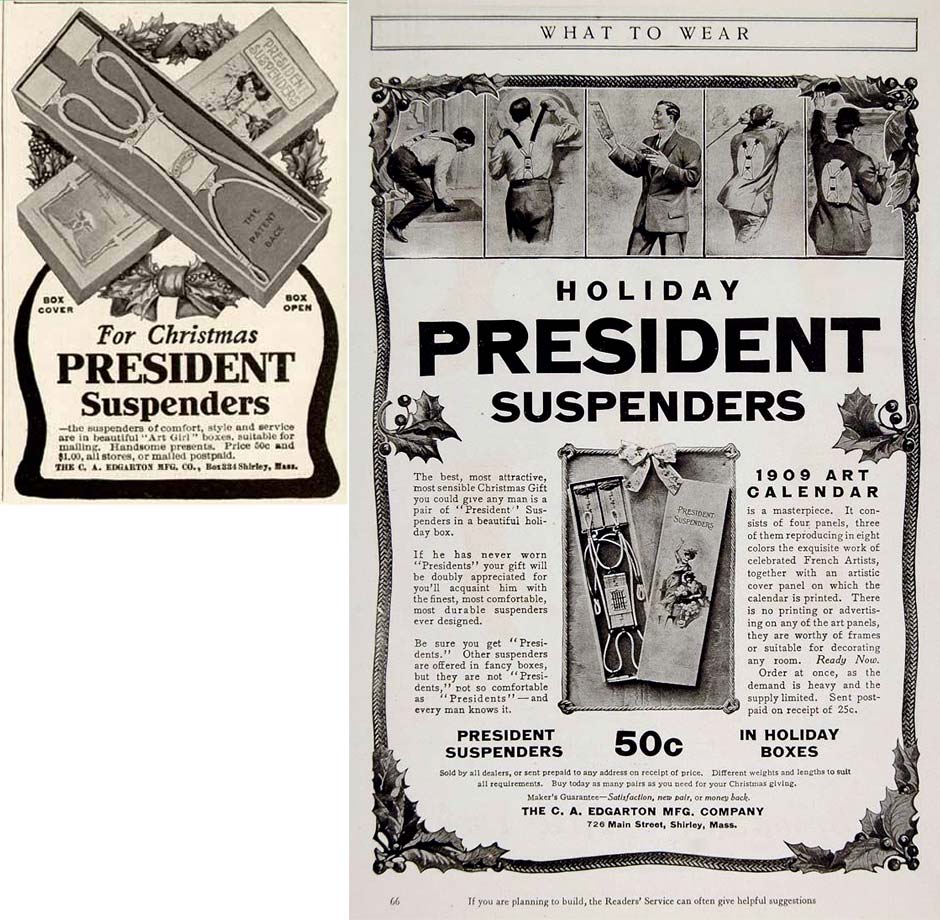 HISTORICAL NOTE: C.A. Edgarton and Sons opened a factory in 1881 on Leominster Road in Shirley, Mass to produce webbing for suspenders and garters. Around 1900 it became known as the President Suspender Company. About 1930 George Frost Belt Company merged with the Suspender Company. In the early 1960's the President name was dropped and it was just George Frost Company.
