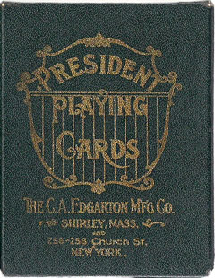 An historic American advertising deck for the C. A. Edgarton Mfg Company, manufacturers of the President Suspender (known as “braces” in England) depicting 16 U.S. Presidents on the Kings and Jacks and First Ladies on the Queens. Advertising appears on the backs, Ace of Spades, Joker, court cards and box. The deck also has an obvious patriotic message.