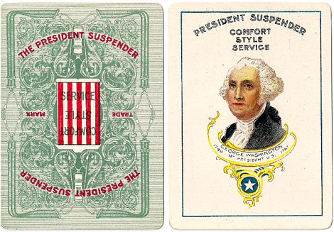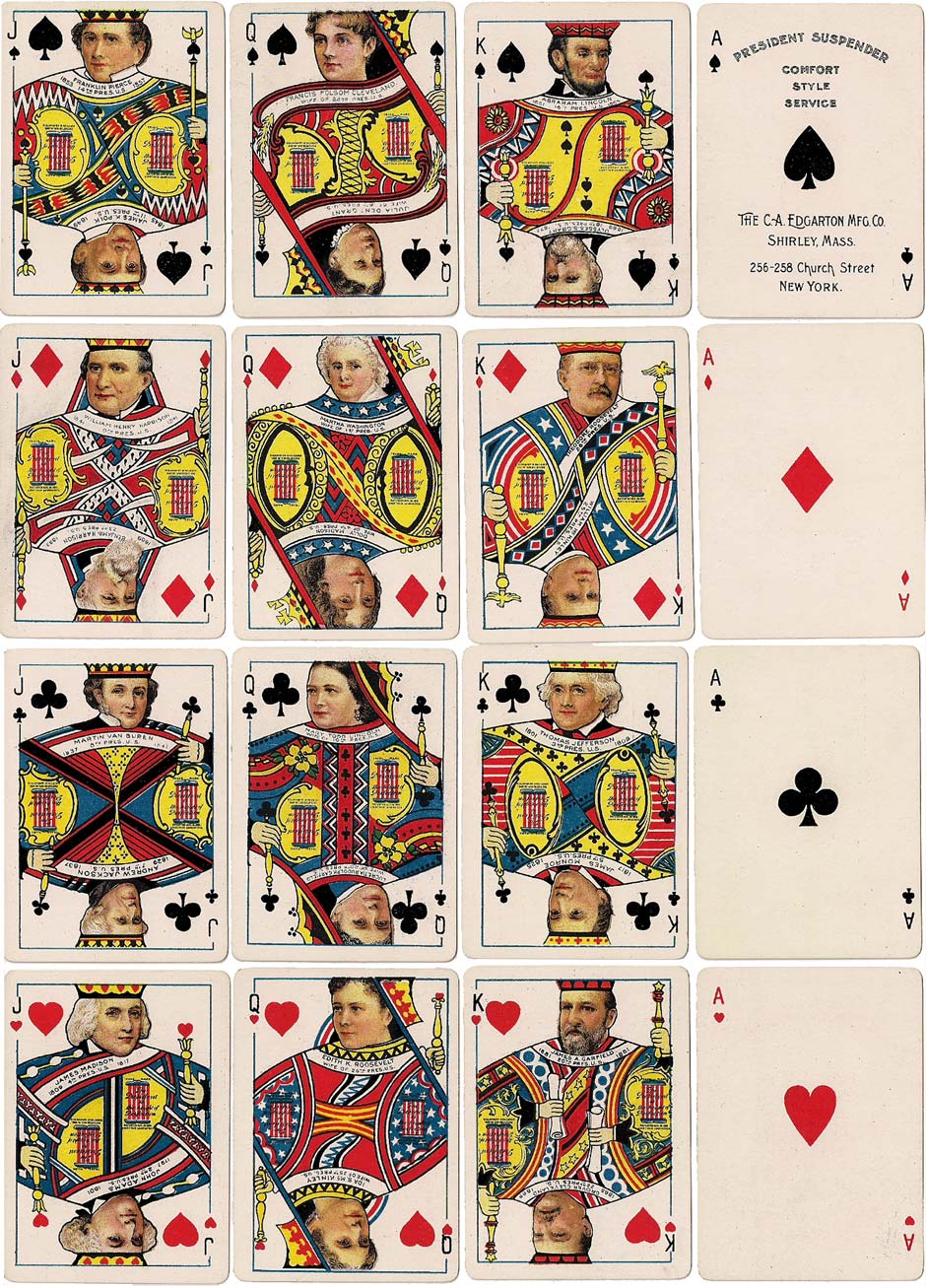 An historic American advertising deck for the C. A. Edgarton Mfg Company, manufacturers of the President Suspender (known as “braces” in England) depicting U.S. Presidents and First Ladies on the courts.