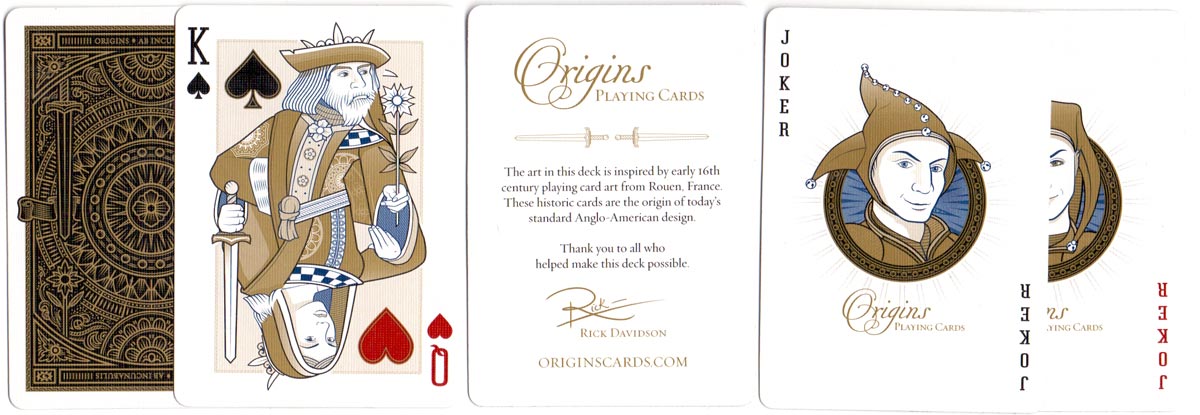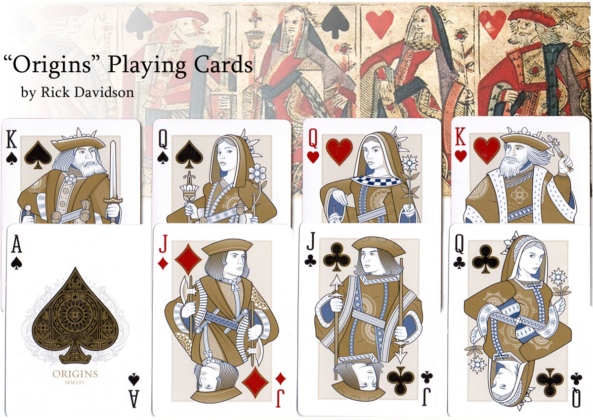 Rick Davidson's “Origins” playing cards is an inspired, present-day re-design of a celebrated medieval playing card pattern, one which has become universal the world over... that is, the original design for our standard Anglo-American deck.