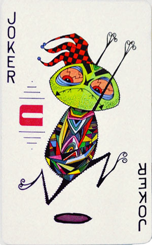 Above: Coricidin © Demilets™ pharmaceutical playing cards manufactured by the United States Playing Card Co. for Schering Corporation, 1967. 52 cards + 2 jokers + leaflet in special box . Bridge size: 89mm x 58mm. The reverse features rows of pills with the “Schering” name and logo on them. The joker (right) depicts the cold bug being chased out of the picture by the big ‘C’ symbol of Coricidin. Images courtesy Rex Pitts.