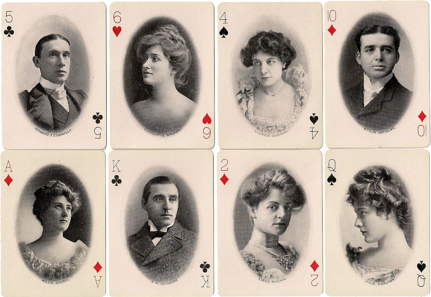 The court cards and Aces each feature four portraits of famous theatre stars from the 1890s inside r...