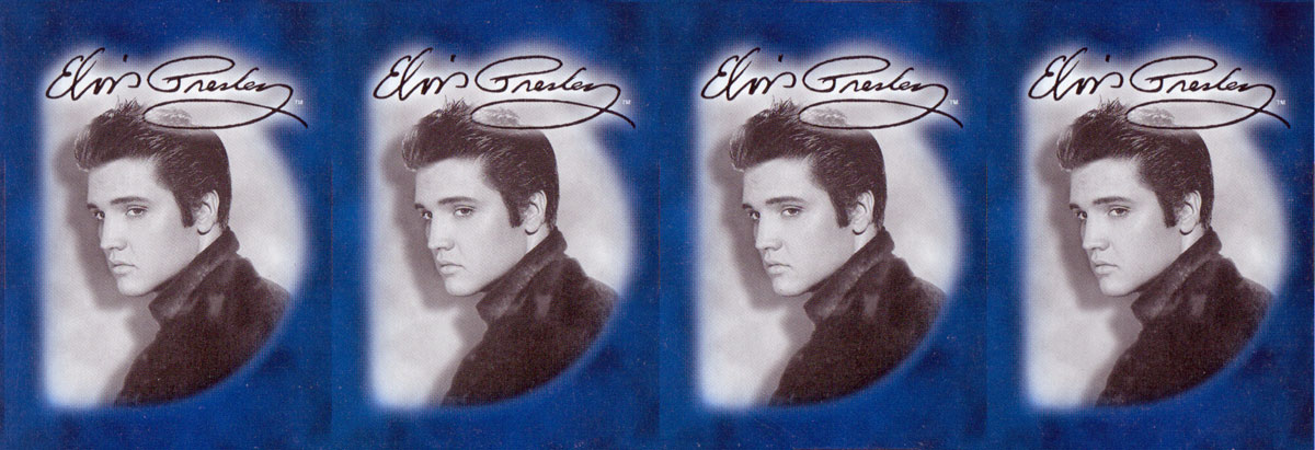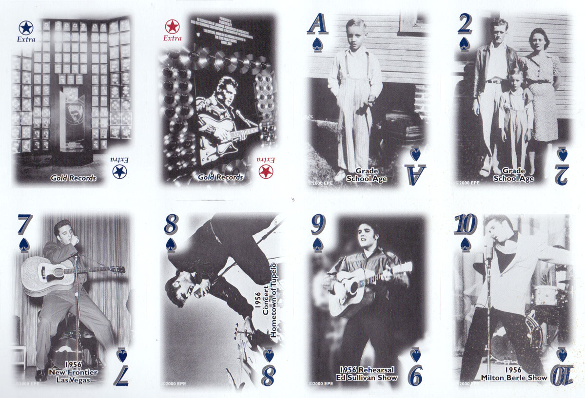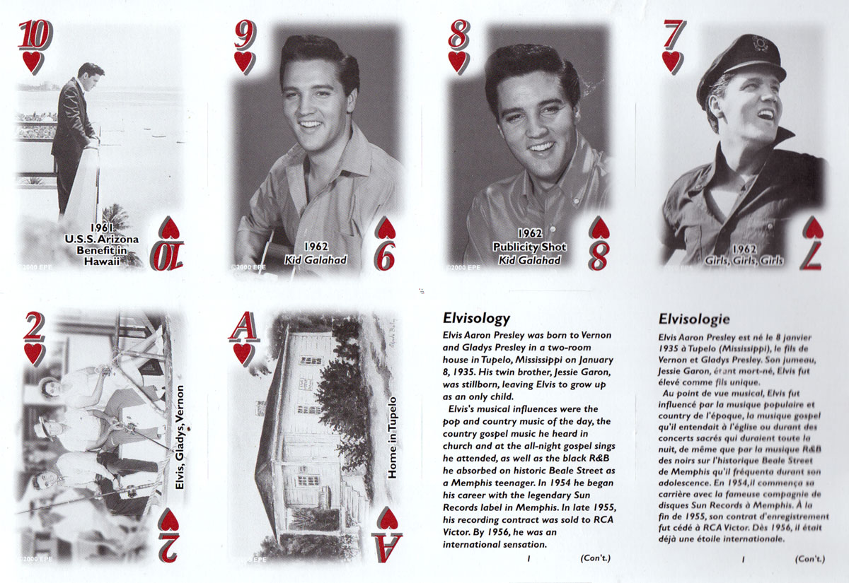 Above: Elvis Presley playing cards from an uncut sheet published by The United States Playing Card Company, c.2002. 52 cards + 2 Jokers + 2 “Elvisology” cards.