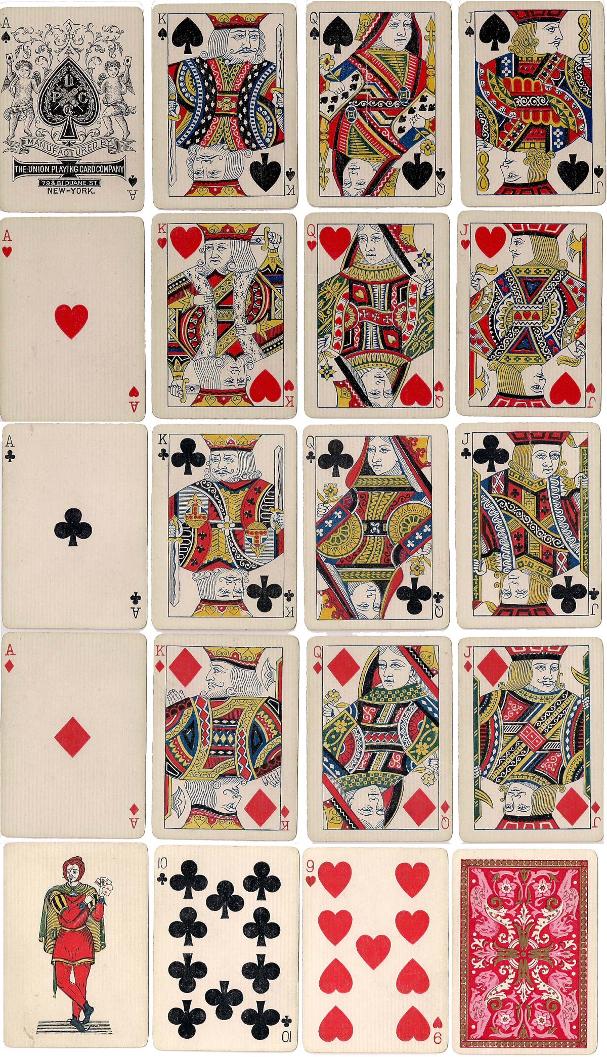 This set was one of Union P. C. Co’s specialties and contained 2 rolls of small poker chips to play on trains, etc. The ace of spades has the initials U.P.C.Co in the centre. The courts are similar to those used by Russell & Morgan. The Joker is unusual in that it is not denominated as such nor does it carry any marking to indicate that it is a joker and finally, it does not carry any indication of the brand name of the deck or that of the manufacturer.