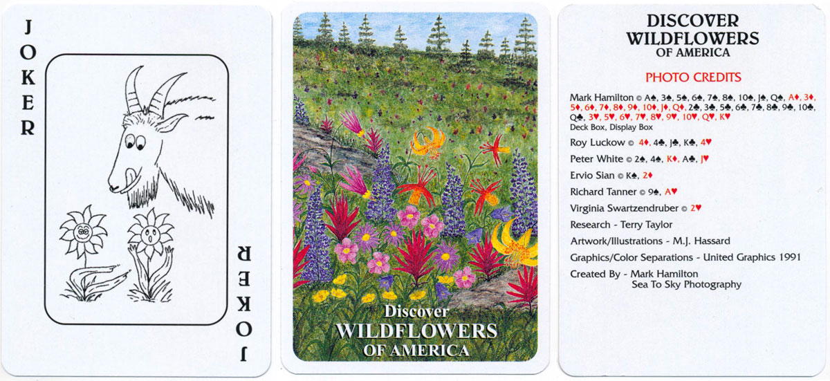 “Discover Wildflowers of America” playing cards manufactured by Carta Mundi (US), and created by Mark Hamilton and Sea to Sky Photography. The deck comprises 52 cards, each having a photograph of a different in-situ wild flower; two identical jokers and a photo credits third joker card.