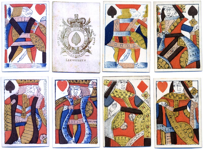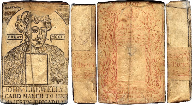 ohn Llewellyn was a playing card manufacturer active between the years 1778-1785. During this period he traded at No. 25 Piccadilly, London. The image above shows an unopened pack of Great Mogul playing cards, in it's original wrapper, still bound with the string and showing the embossed tax stamps. 'Her majesty' would have been Queen Charlotte, wife of George III. It is not known whether John Llewellyn was a Welshman, or a descendant of a Welsh family who had moved away, but it seems likely. His name is not in the list of liverymen of The Worshipful Company of Makers of Playing Cards nor does it appear in British Library records. Little is known about him.