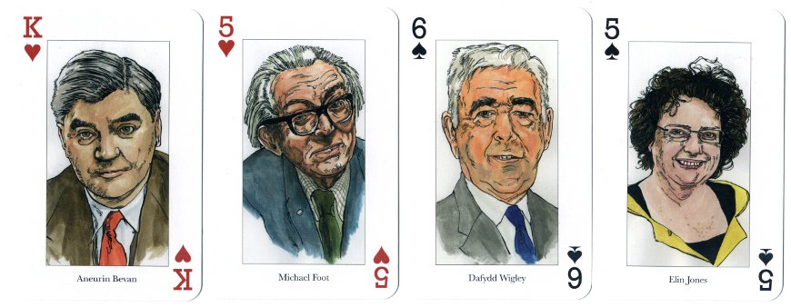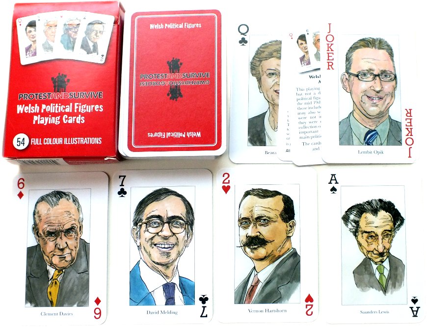 Above: cards from 'Welsh Political Figures' playing cards published by Protest and Survive Ltd, Cardiff. The cards are the combined work of the artist Dan Peterson and political historian Professor Russell Deacon. The first edition is of 1,000 packs only.