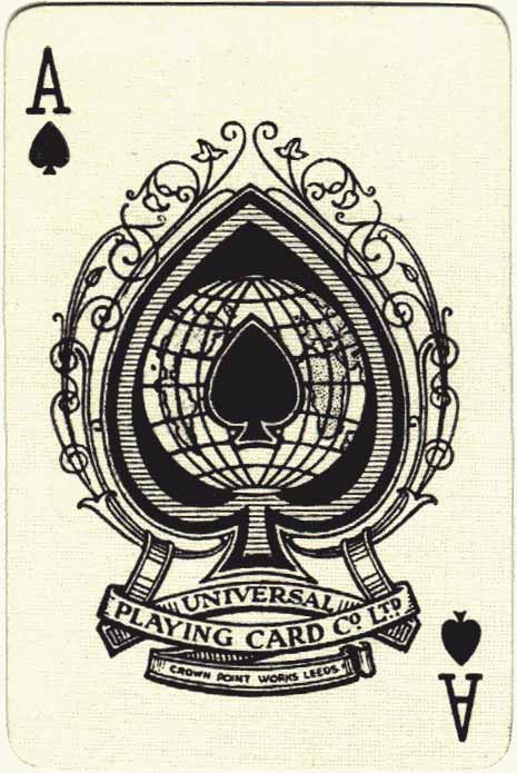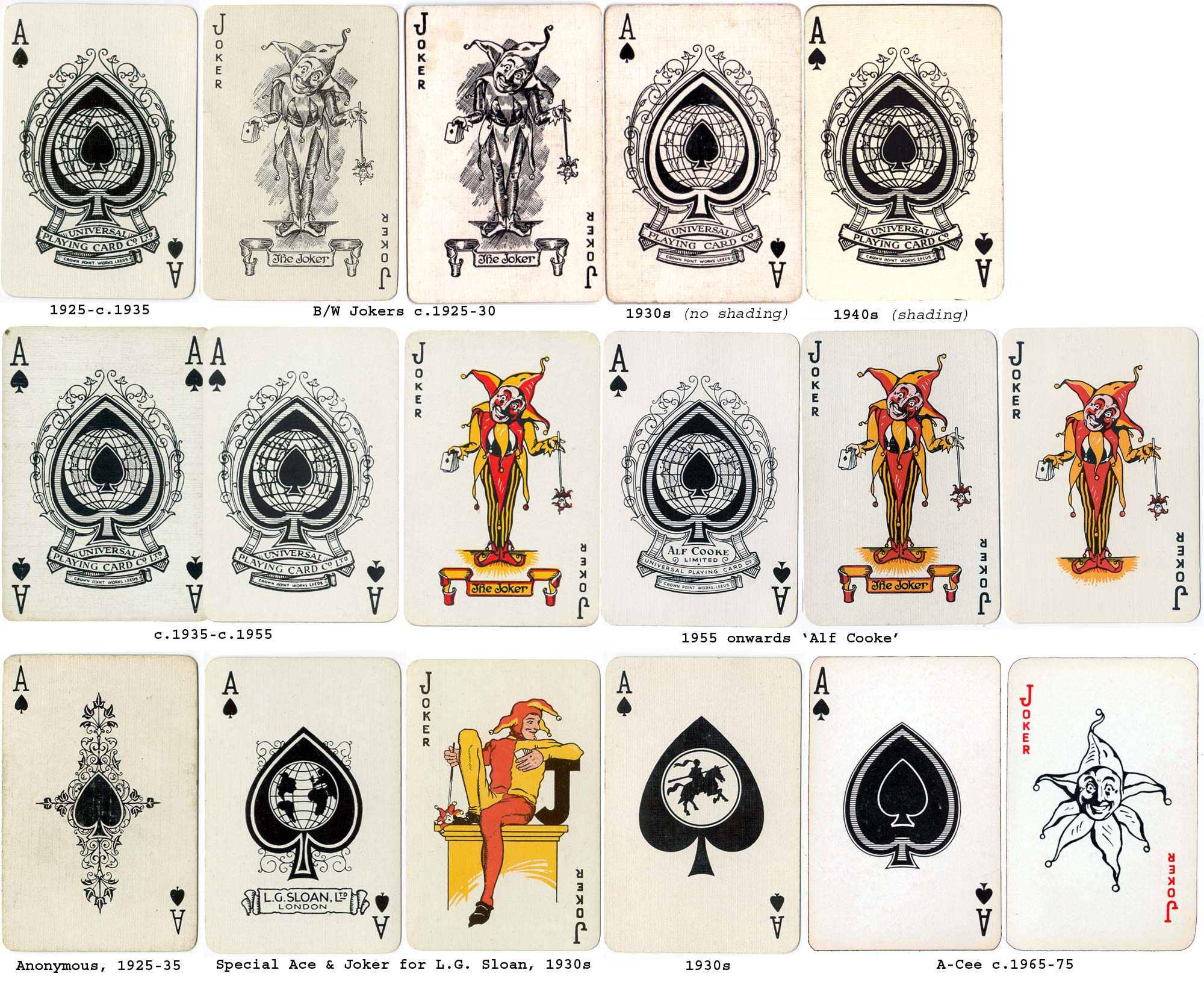 Above: the commonest Alf Cooke Aces of Spades: Universal Playing Card Co. Ltd (1925-55); Universal Playing Card Co. (1930-50); 3. Alf Cooke Limited (1955-70). There are no cut & dried date lines, as the various aces and jokers can be found occurring at different times in different combinations, along with small changes in the plates and miniature pip shapes in the corners over the years. There are several other Jokers but they were manufactured for Scandinavian countries (which have the word 'Joker' instead of 'The Joker'), and also 'single pip' aces of spades, i.e not ornamental.