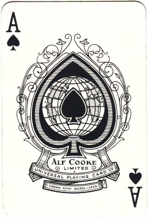 Alf Cooke Limited’, with ‘Universal Playing Card Co’ as a subtitle, appeared on the Aces of Spades from around 1955 onwards, until the business was taken over by the Amalgamated Playing Card Company Ltd, that was then a subsidiary part of Waddingtons, in 1971. The stock and machinery were transferred to Waddingtons and the production of Alf Cooke playing card brands and court card designs ceased. Over the years, Alf Cooke Limited produced a colourful range of standard English playing cards with many art-deco style pictorial back series, fortune-telling and tarot cards, as well as card games for children and adults.