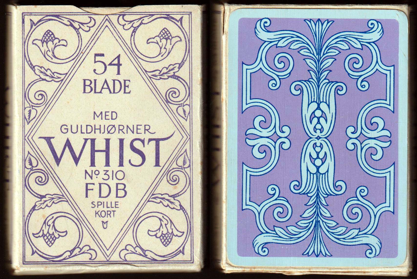 British-made packs for the Scandinavian market – especially in the 1930s – have a certain charm. This one is no exception. It was created in 1933 by the artist Bøgelund for the Danish cooperative FDB (Fællesforeningen for Danmarks Brugsforeninger, or Danish Consumers Cooperative Society, in English), whose initials appear on the box. The courts are in historical costume with swirling robes in rich colours. Fortunately, the artist has signed and dated the Joker (other editions of this pack exist with the Joker left unsigned). The cards have gilt corners and attractive mauve and blue patterned backs. A 40-card version of this pack (for l’hombre) also exists • See the box