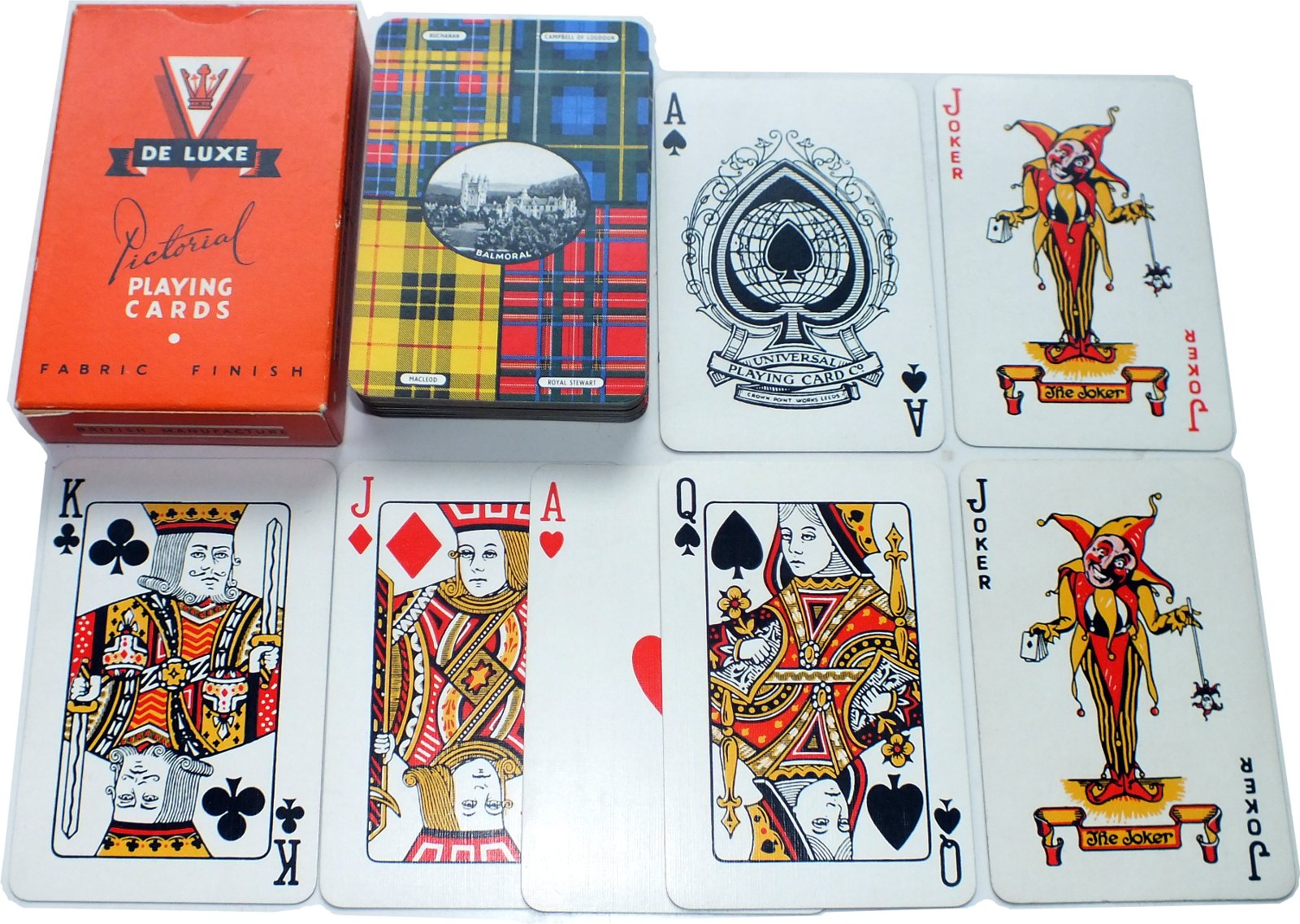 Above: Clan Tartan Pictorial Playing Cards - De Luxe Fabric Finish - manufactured by the Universal Playing Card Co., containing two Jokers and three-colour court cards. The name Alf Cooke Limited is printed on the box. These cards were also sold with Alf Cooke Ace of Spades as "Scottish Tartan" playing cards in a special box for Pepys Games.