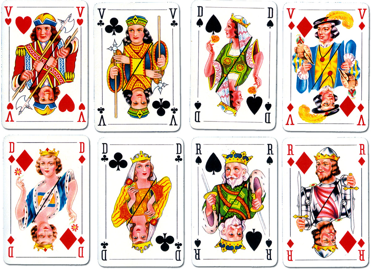 Above: 'Romanian' playing cards, manufactured and exported by the Universal Playing Card Co., Leeds, in the 1930s. French indices R, D, V on the courts and '1' on the aces.