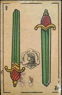 Algeria is a gateway between Africa and Europe. A version of the old Spanish National pattern was produced by Jacques Sellon of Marseille and Fossorier, Amar & Cie of Paris for North African countries (Algeria & Morocco). Cards were also made by Camoin (Marseille), Malka Frères (Casablanca) and other anonymous manufacturers for export to Algeria. These were usually distinguished by a preponderance of green and a repeating pattern of stars and crescents on the backs. The tax stamp can be seen on the two of swords.