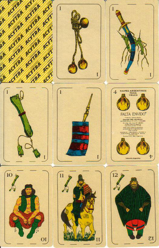 Above: Naipes Argentinos para Truco "Falta Envido" created by Alberto Soifer and printed by Adans S.A., Buenos Aires, 1982. 40 cards, with Gauchesque courts and non-standard suit symbols. Packs with advertising on the reverse are also known.