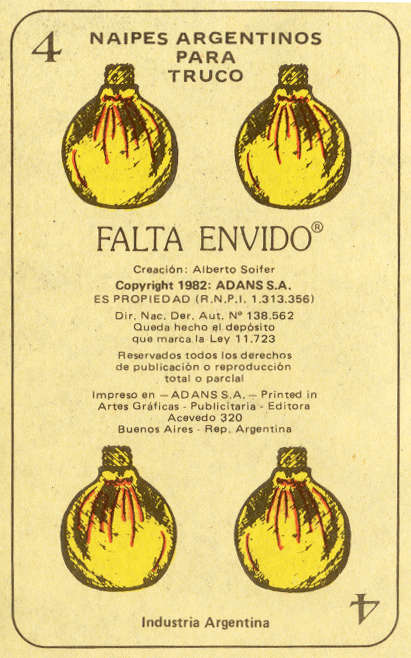 Naipes Argentinos para Truco 'Falta Envido' created by Alberto Soifer and printed by Adans S.A., Buenos Aires, 1982