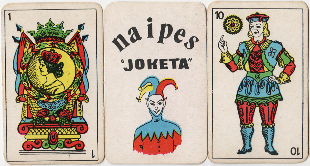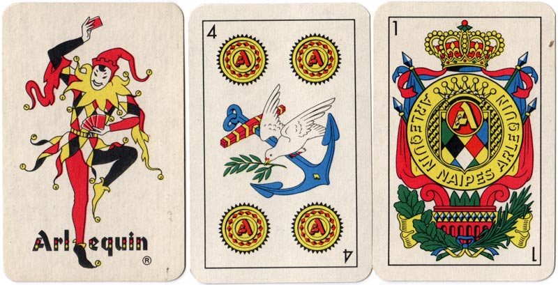 Right: cards from “Naipes Joketa” by anonymous manufacturer, c.1975. A slightly elaborated version of conosur pattern.