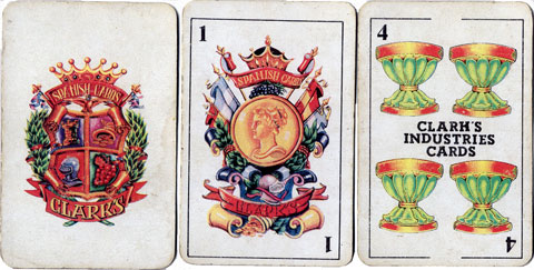 Right: cards from an original Spanish-suited pack titled 'Spanish Cards' published by Clark's Industries, c.1975. 48 cards + 2 Jokers.